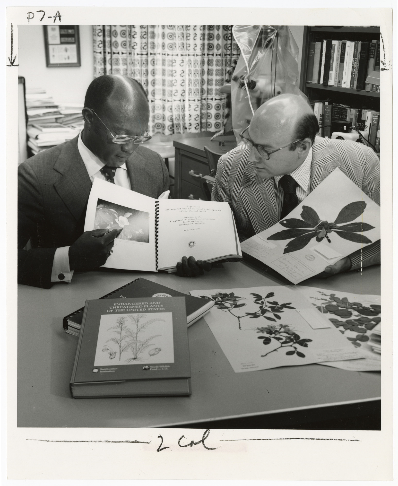 Edward Ayensu, curator of plant anatomy and director of the Endangered Species Program at National Museum of Natural History, and Robert DeFilipps, coordinator of the Program's Endangered Flora Project, examine specimens of dried plants listed in a new Smithsonian Institution reference book entitled "Endangered and Threatened Plants of the United States," jointly published by the Smithsonian and the World Wildlife Fund, Inc.