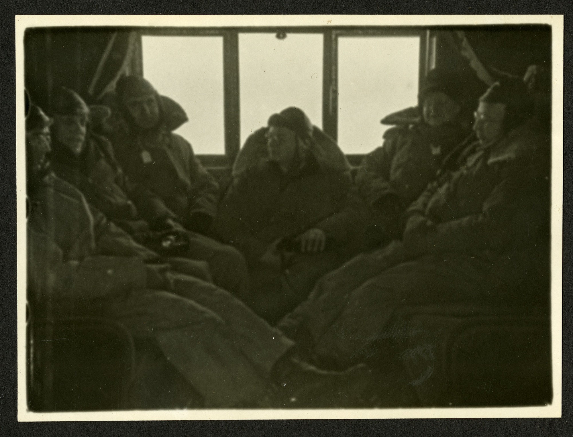 Crew and scientists for the solar eclipse expedition, on board the dirigible U.S.S. Los Angeles. Left to right: Chester Burleigh Watts (1889-1971), astronomer, U.S. Naval Observatory; Frank Bowers Littell (1869-1951), astronomer, U.S. Naval Observatory; Carl Clarence Kiess (1887-1967), astronomer and physicist, U.S. Bureau of Standards; Watson Davis (1896-1967), Managing Editor, Science Service; George Henry Peters (1863-1947), astronomer, U.S. Naval Observatory; and Edwin Taylor Pollock (1870-1943), Superintendent of the U.S. Naval Observatory.
