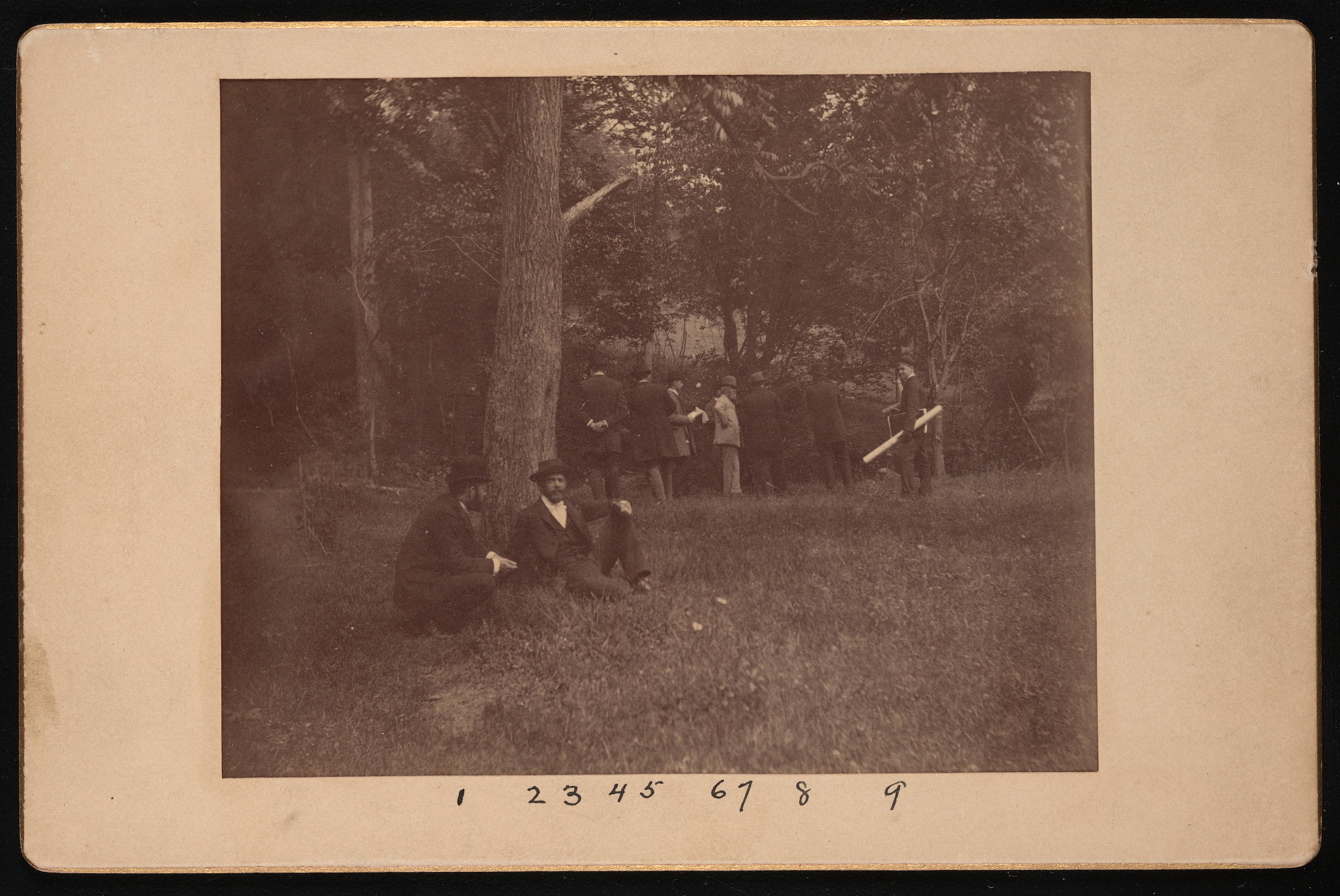 With (left to right) W.C. Winlock, G.B. Goode, C.W. Schuermann, W.T. Hornaday, J.G. Traylor, F.L. Olmsted, Secretary Langley, Dr. Frank Baker, and H.W. Dorsey.