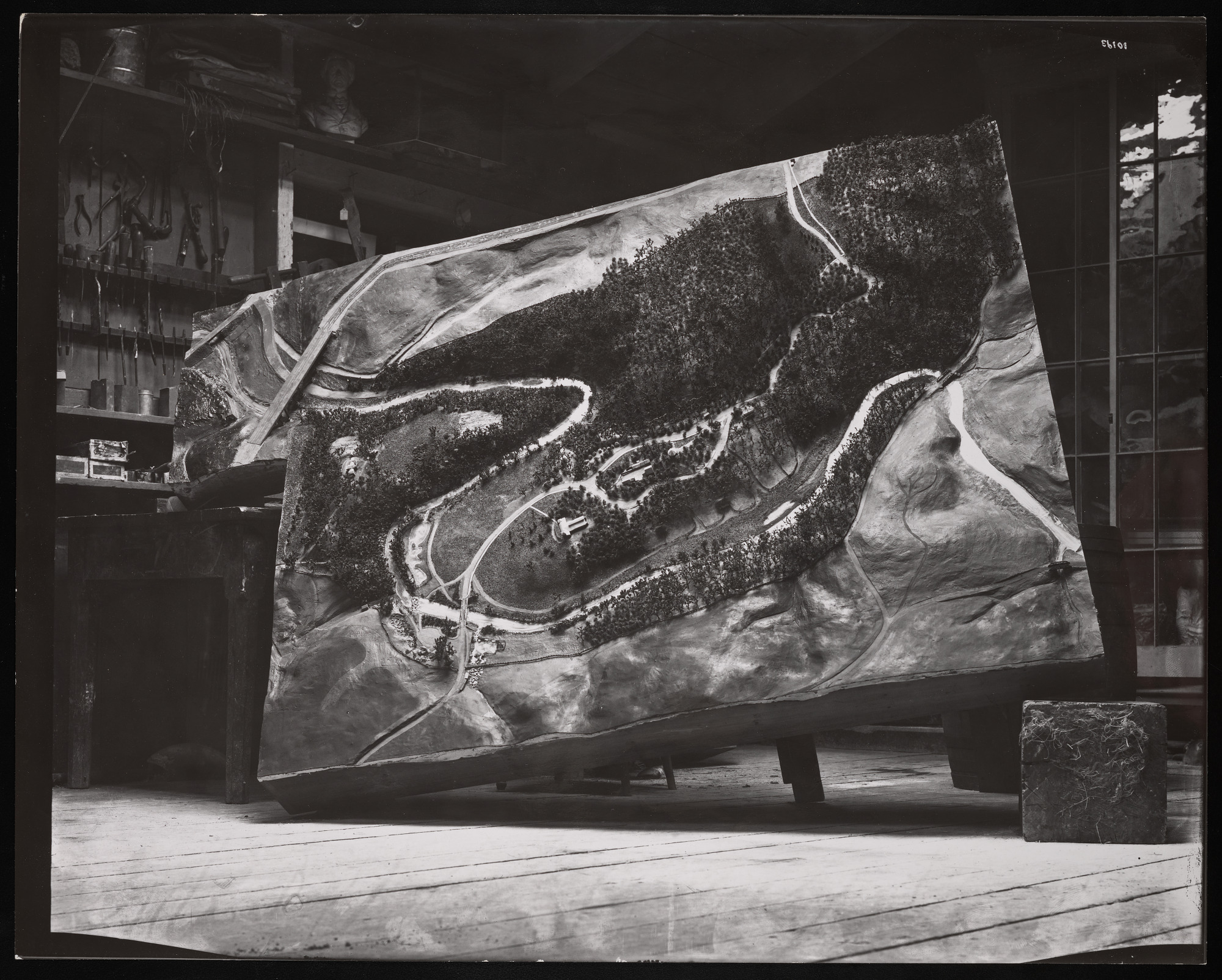 Early relief model of the grounds and buildings at the National Zoological Park site at Rock Creek Park, prepared by William Temple Hornaday.