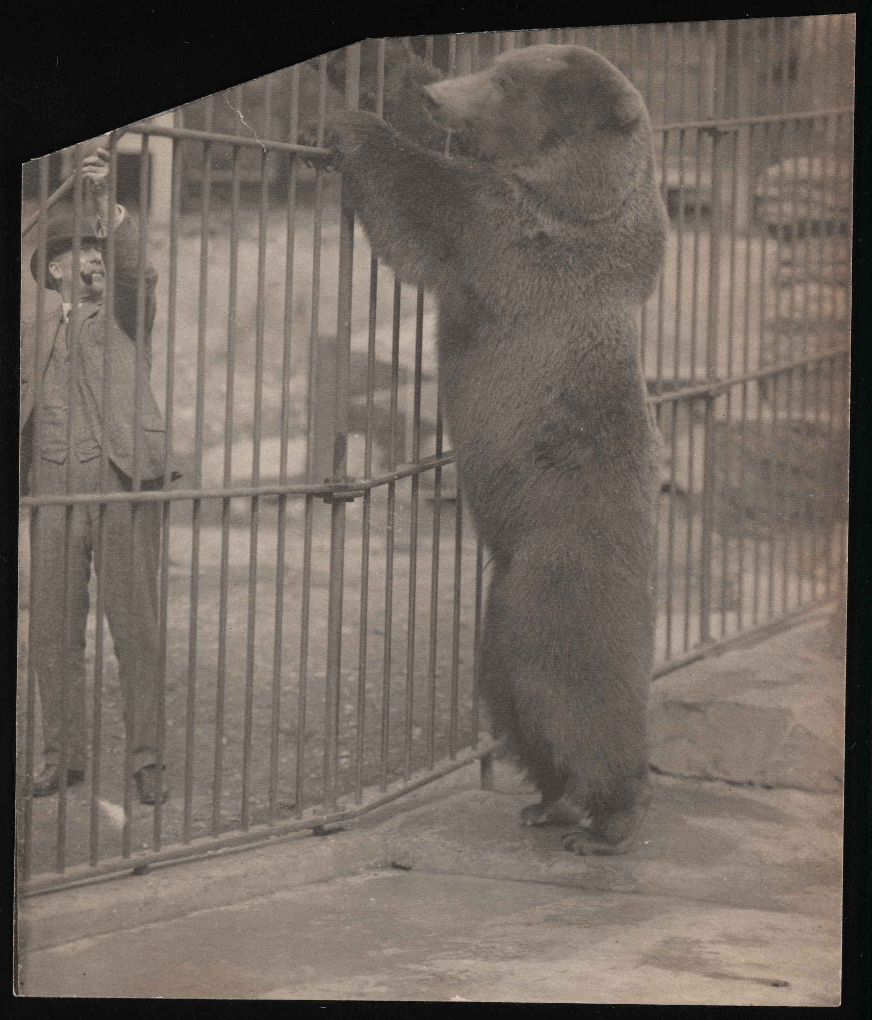 Head Keeper William H. Blackburne holds a pole, partially out of view, that reaches into the enclosure of Buster.