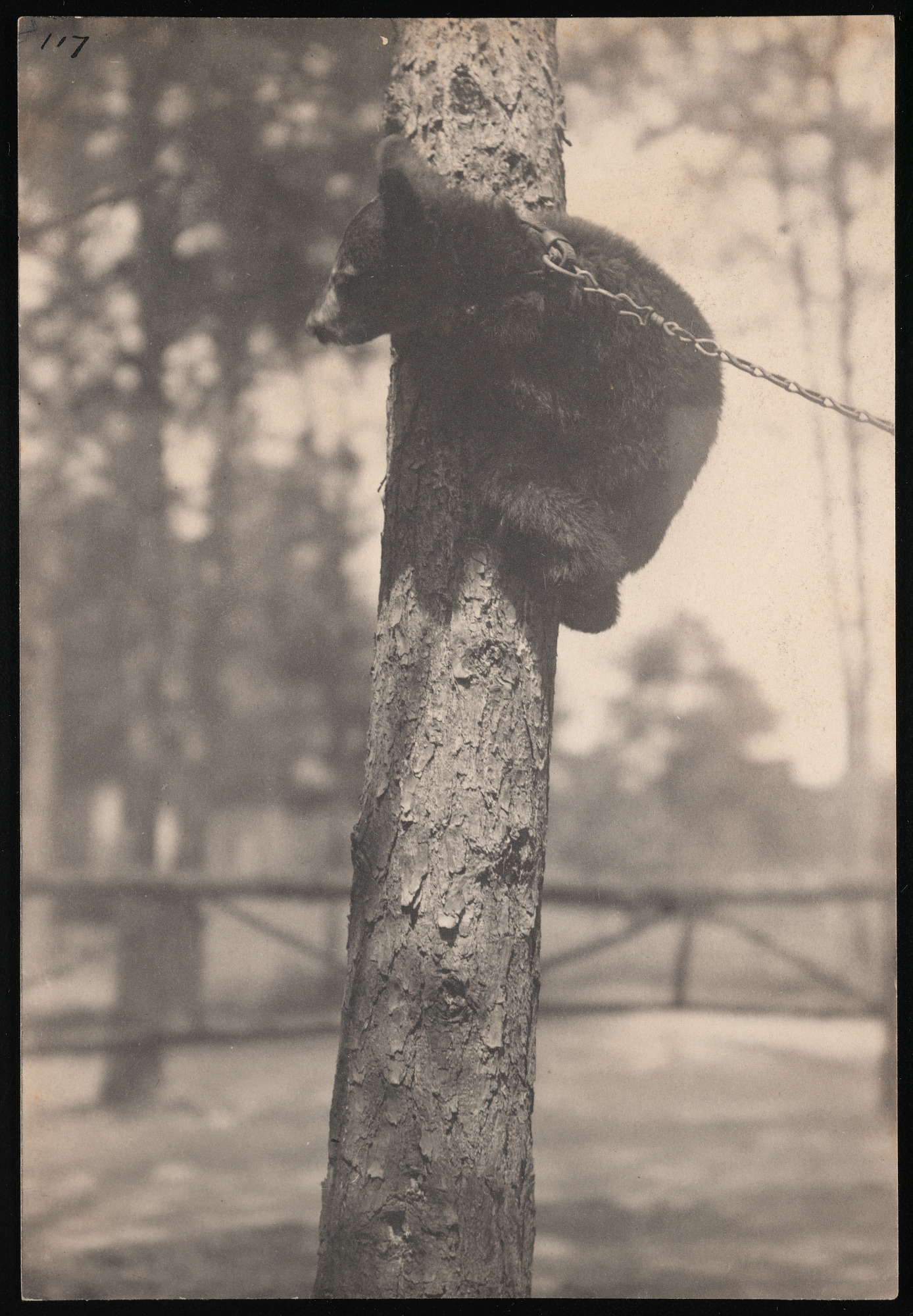 Black bear cub, wearing collar attached to chain, in tree.