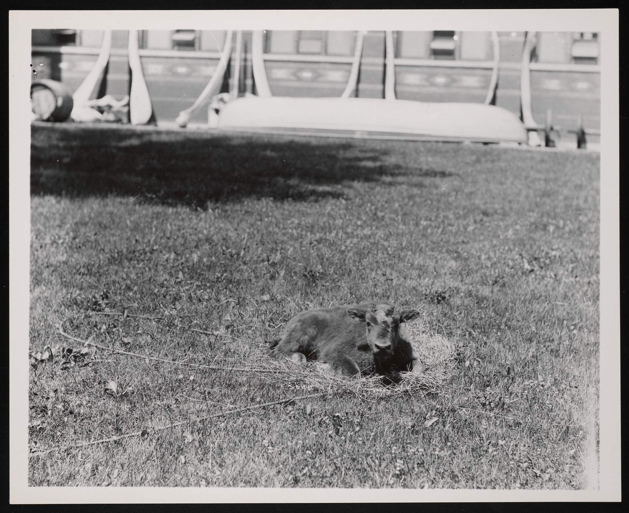 Calf in the South Yard behind the Smithsonian Institution Building, or Castle, with the Arts and Industries Building in view.