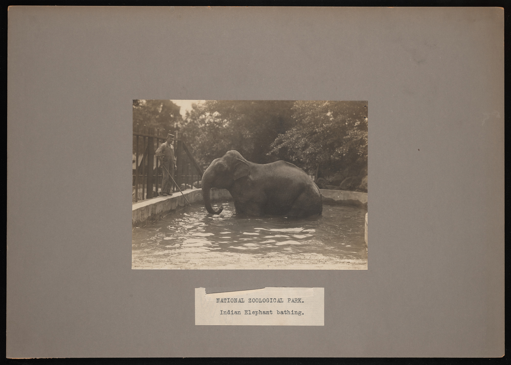 Keeper C.W. Lewis with Indian elephant "Dunk" wading in a pool in the yard outside the Elephant House.