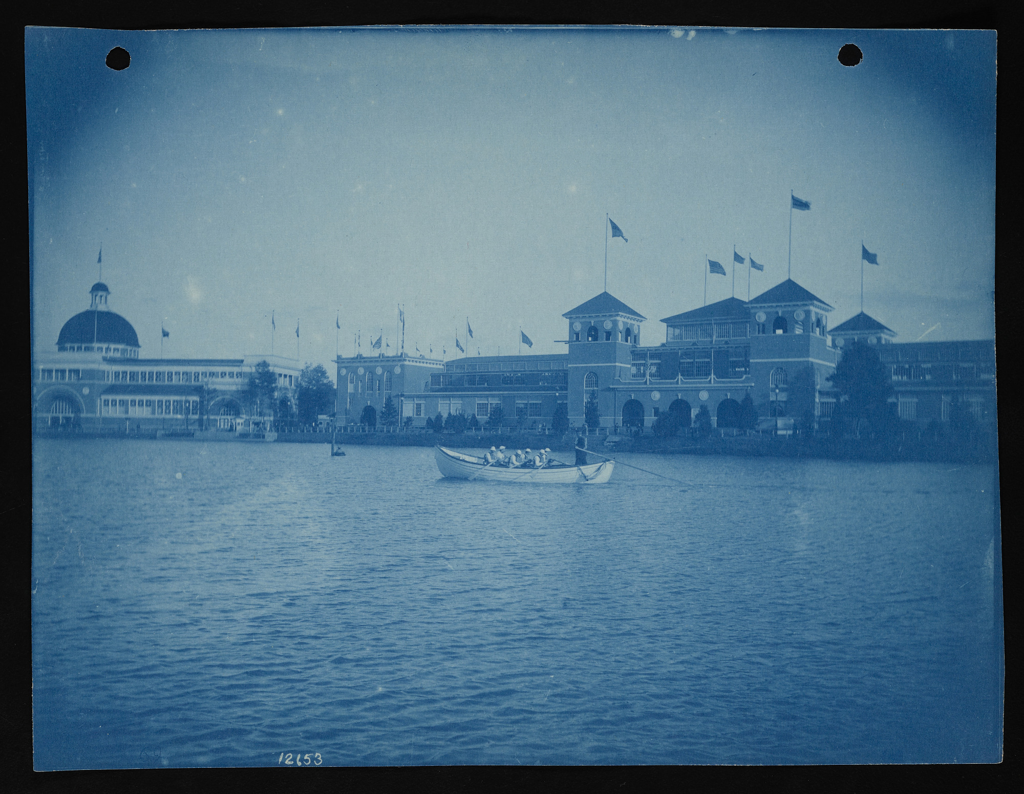 Exterior view of buildings and grounds, with Life-saving Service demonstration on Lake Clara Meer with Transportation Building and Electricity Building in background.