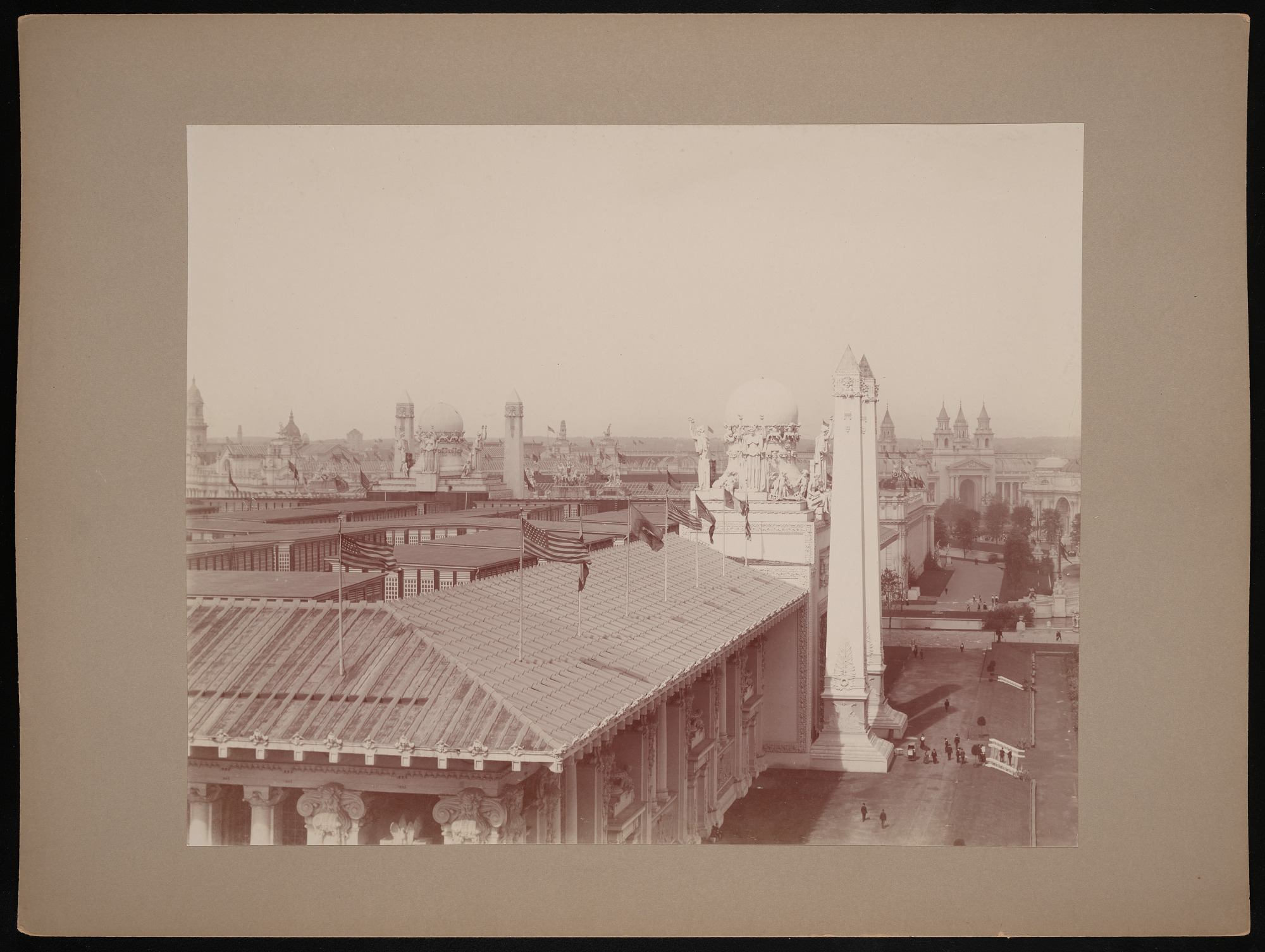Exterior view of buildings and grounds, with Sunken Garden, Palace of Mines and Metallurgy, Palace of Education and Social Economy, Palace of Varied Industries, Palace of Manufactures, and Palace of Liberal Arts in view.