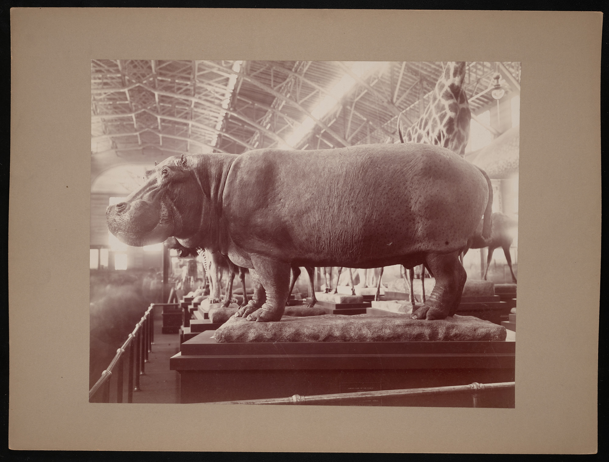 Interior view, Smithsonian Institution and United States National Museum exhibits in the United States Government Building, featuring taxidermy model of a hippopotamus, presented by the Division of Mammals, Department of Biology.