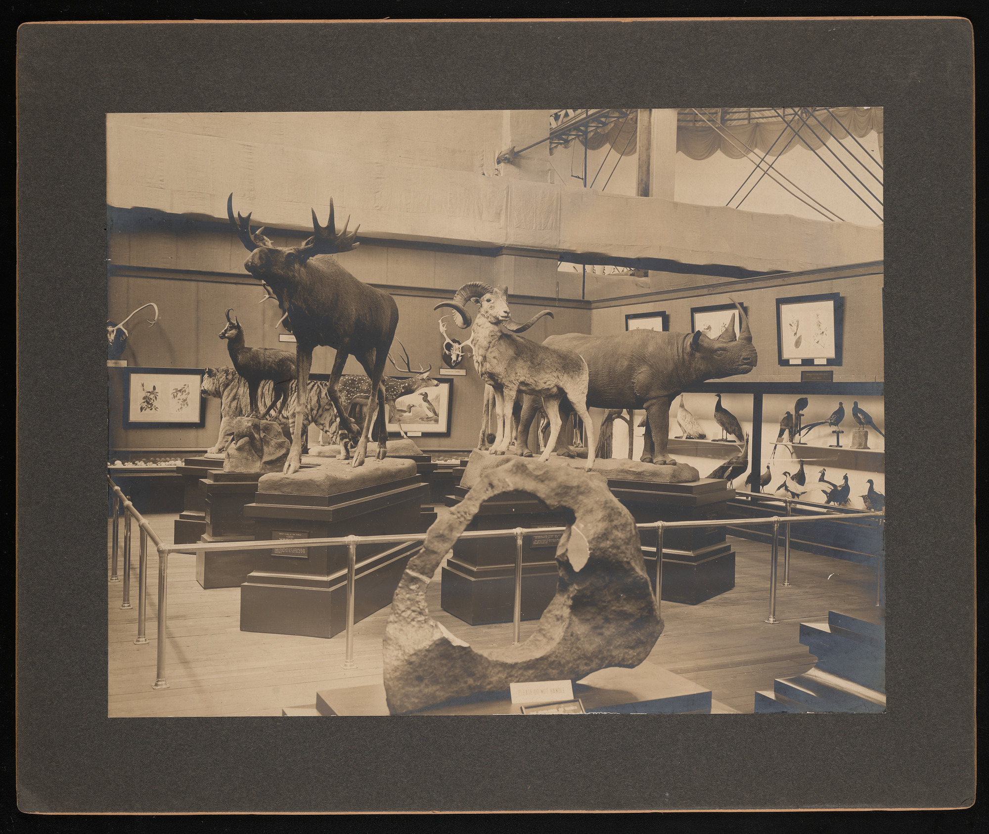 Interior view, Smithsonian Institution and United States National Museum exhibits in the United States Government Building, featuring taxidermy mounts of large mammals and a cast of the Tucson Ring meteorite, presented by the Division of Mammals, Department of Biology and the Department of Geology.