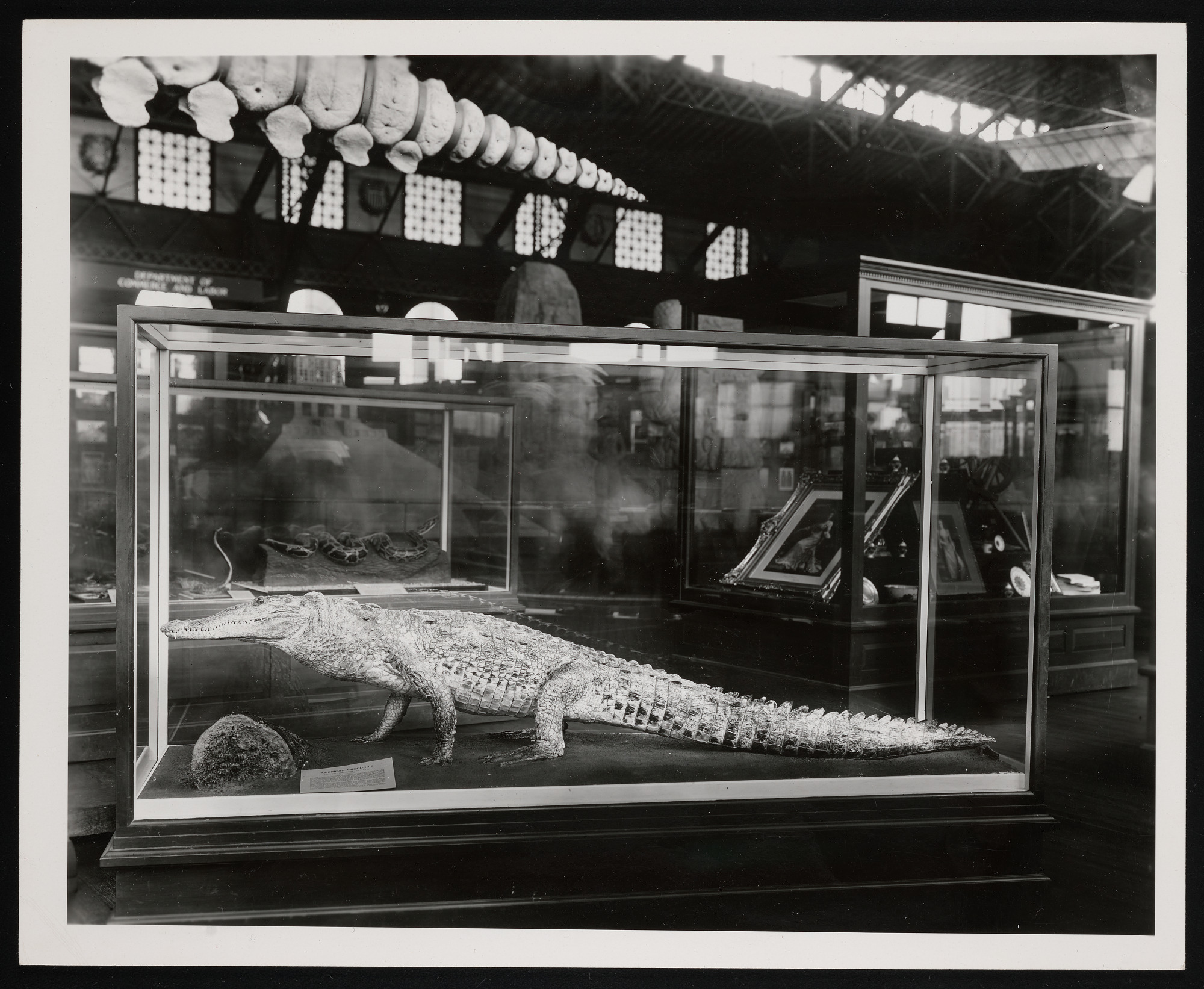 Interior view, Smithsonian Institution and United States National Museum exhibits in the United States Government Building, featuring taxidermy mount of American crocodile presented by the Division of Reptiles and Batrachians, Department of Biology.