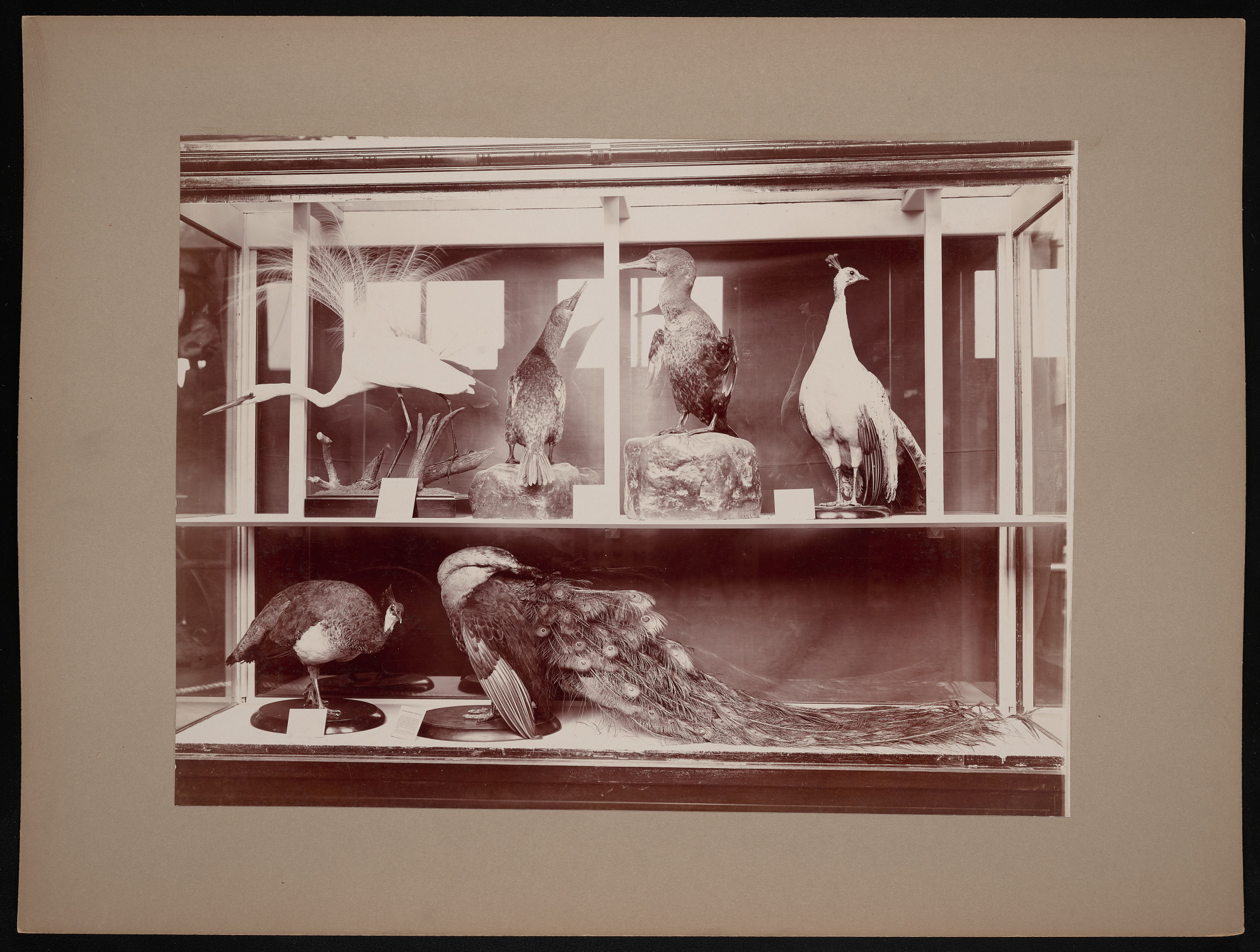 Interior view, Smithsonian Institution and United States National Museum exhibits in the United States Government Building, featuring taxidermy models of "Rare or Interesting Birds" presented by Division of Birds, Department of Biology.