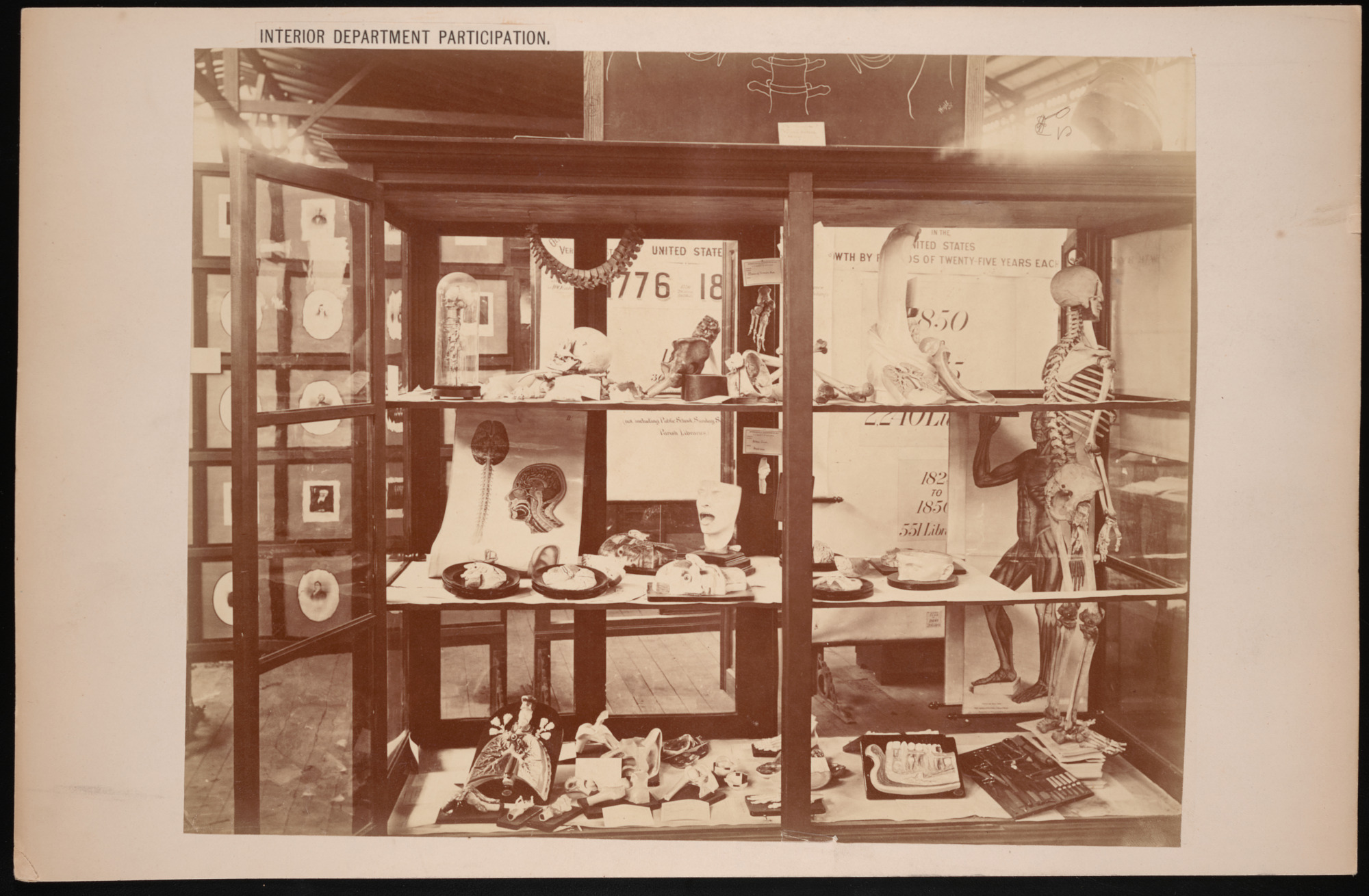 Interior view, Department of the Interior exhibits in the United States Government Building, featuring items illustrating human biology.
