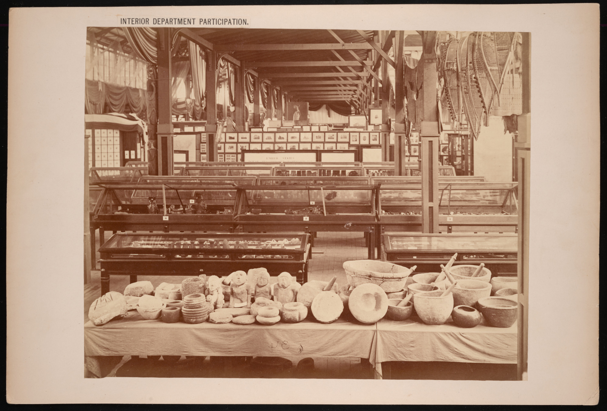 Interior view, Department of the Interior exhibits in the United States Government Building, featuring archeological and anthropological artifacts, prepared by Bureau of Indian Affairs and Smithsonian Institution.