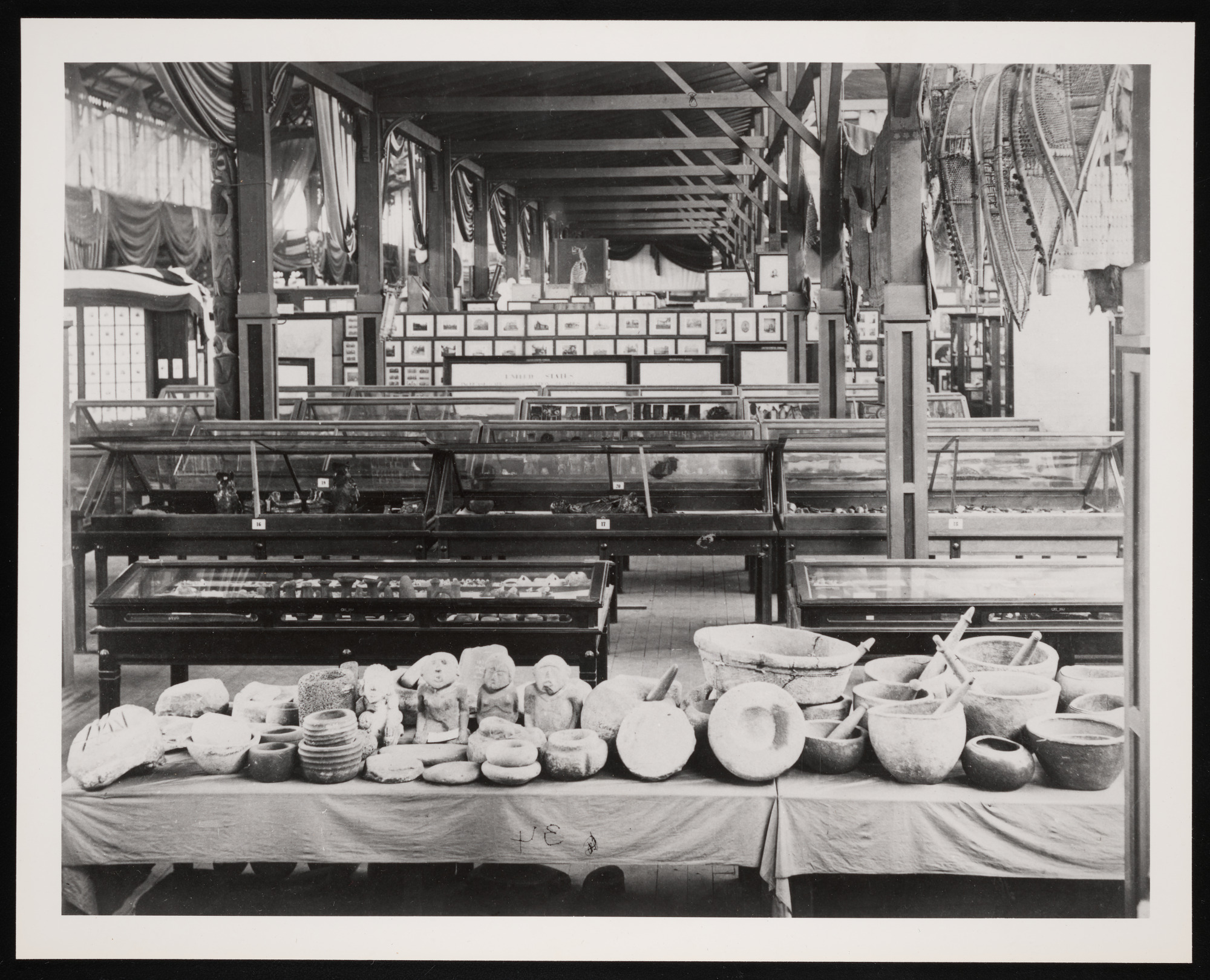 Interior view, Department of the Interior exhibits in the United States Government Building, featuring archeological and anthropological artifacts, prepared by Bureau of Indian Affairs and Smithsonian Institution.