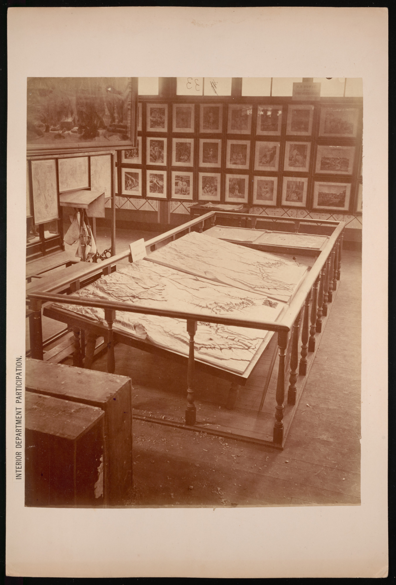 Interior view, Department of the Interior exhibits in the United States Government Building, featuring Bureau of Indian Affairs and Geological Survey of the Territories.
