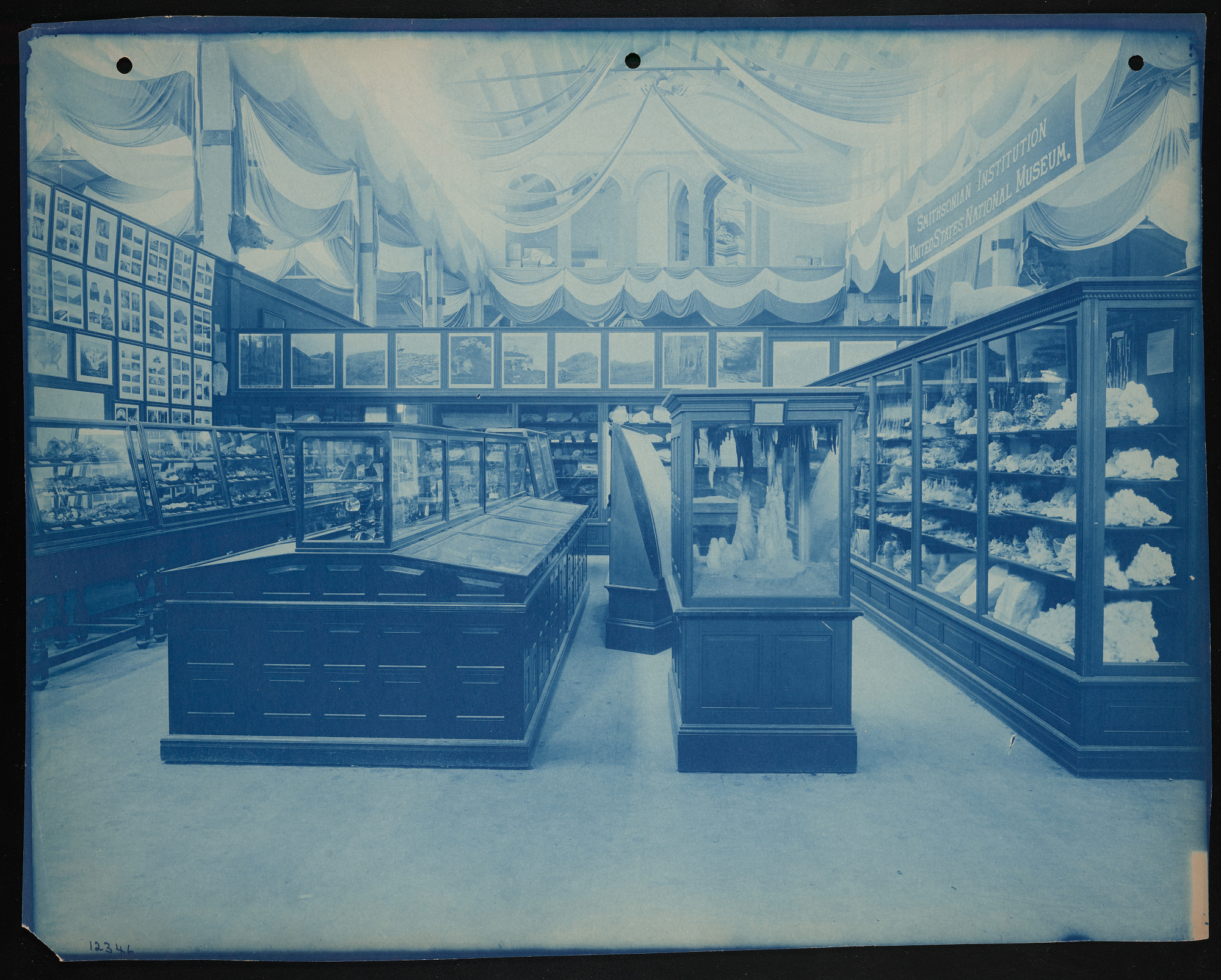 Interior view, Smithsonian Institution and United States National Museum exhibits in the United States Government Building, featuring Department of Mineralogy and Department of Geology.