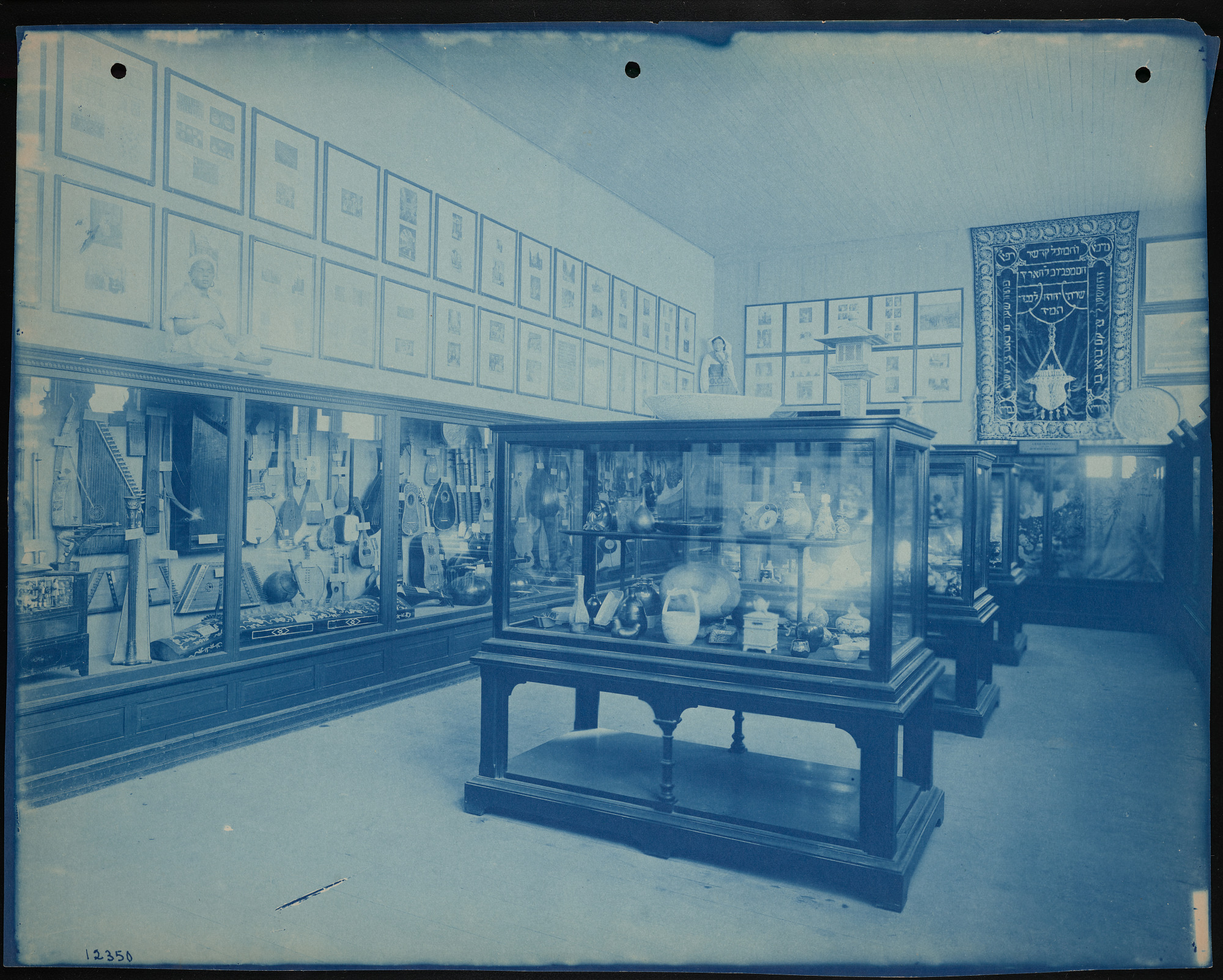 Interior view, Smithsonian Institution and United States National Museum exhibits in the United States Government Building, featuring Division of Oriental Antiquities and Department of Arts and Industries collection of musical instruments.