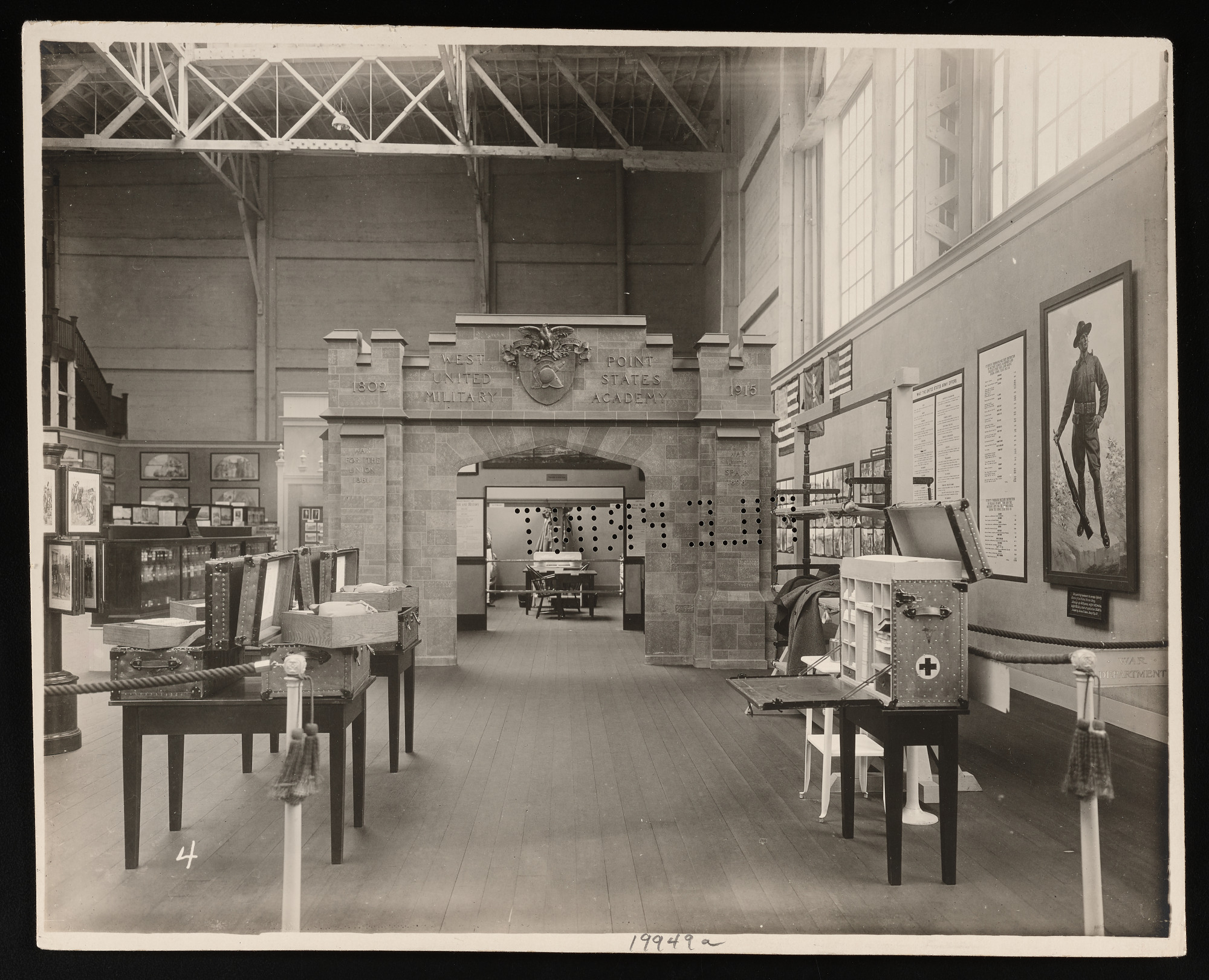 Interior view, Department of War exhibits in the Palace of Liberal Arts, featuring United States Military Academy West Point.
