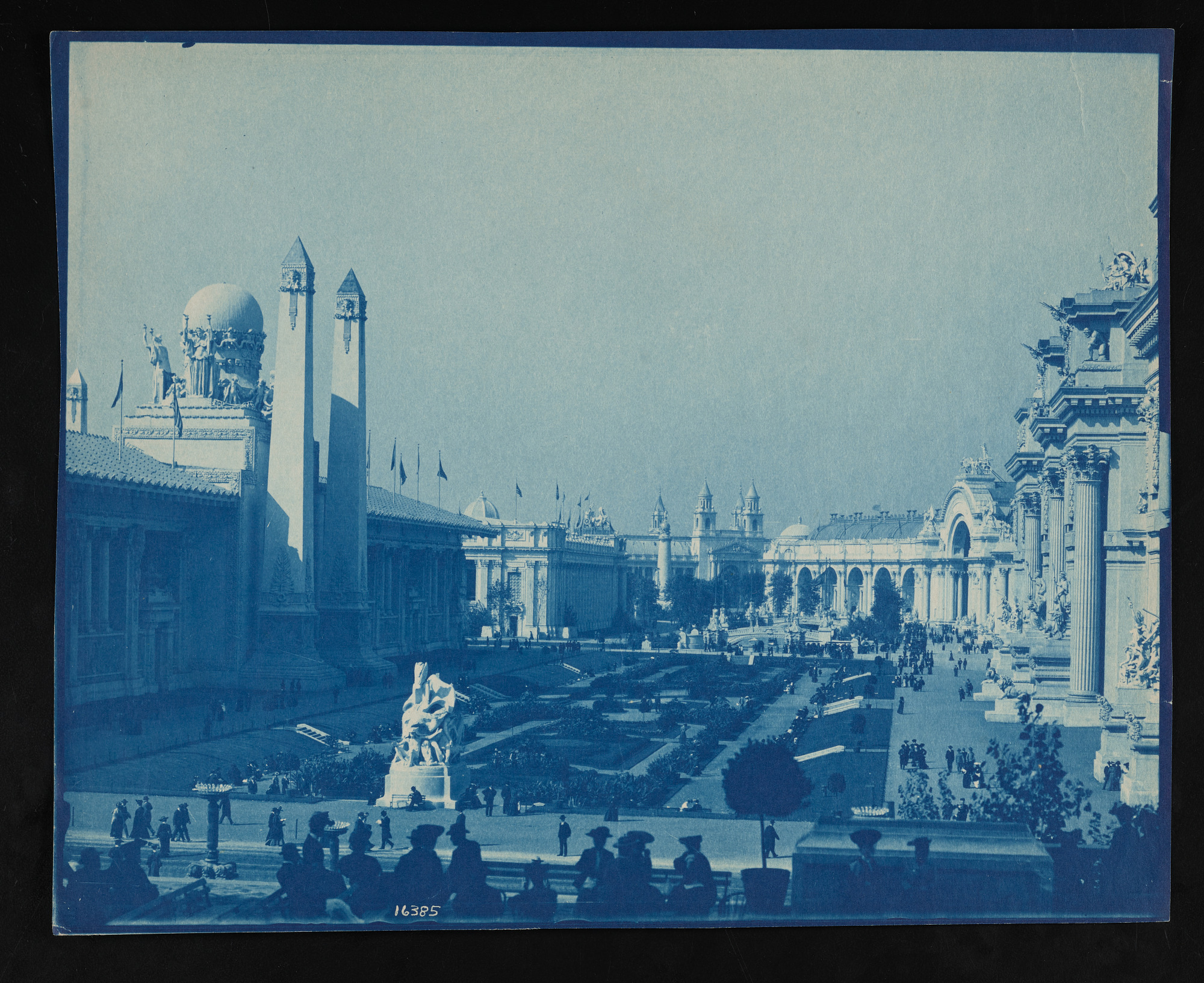 Exterior view of buildings and grounds, with Sunken Garden, Palace of Mines and Metallurgy, Palace of Education and Social Economy, Palace of Varied Industries, Palace of Manufactures, and Palace of Liberal Arts in view.