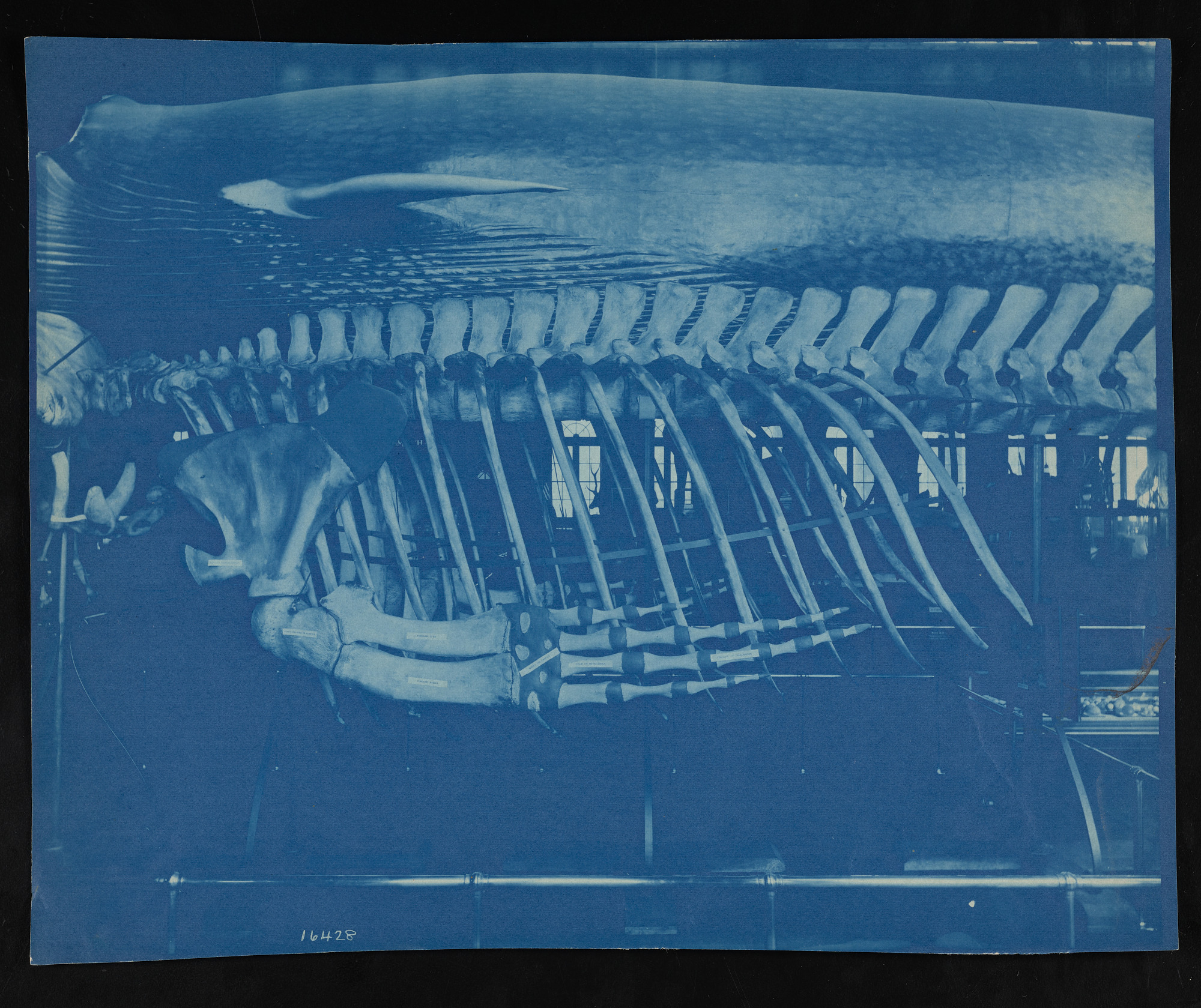 Interior view, Smithsonian Institution and United States National Museum exhibits in the United States Government Building, featuring midsections of cast of blue whale (sulphur-bottom whale) and skeleton of blue whale, presented by the Division of Mammals, Department of Biology.