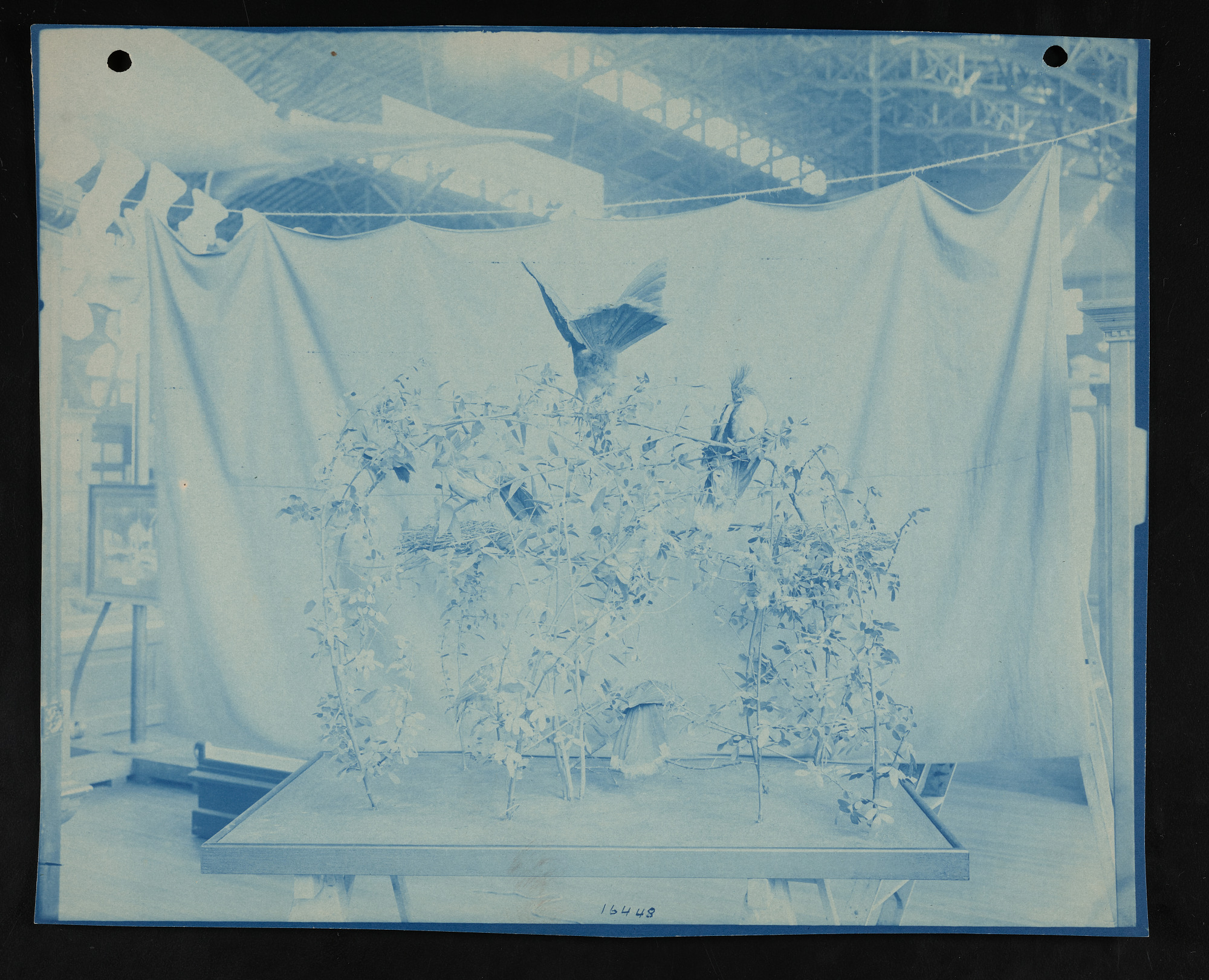 Interior view, Smithsonian Institution and United States National Museum exhibits in the United States Government Building, featuring taxidermy specimens depicting the life history of the tropical bird Hoatzin, with bush and branches, presented by the Division of Birds, Department of Biology.