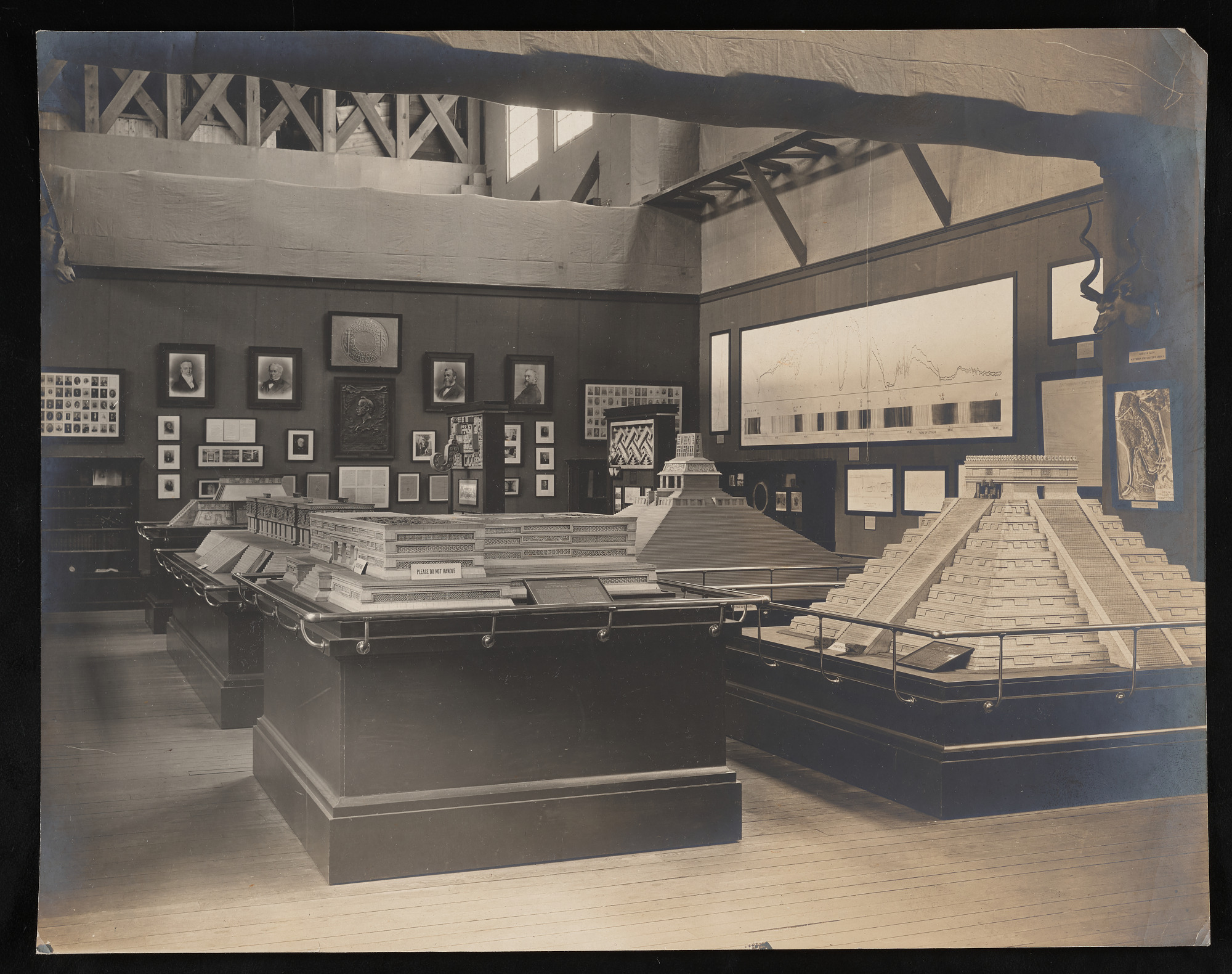Interior view, Smithsonian Institution and United States National Museum exhibits in the United States Government Building, featuring reproductions of temples built by the ancient civilizations in Mexico and Yucatan, presented by the Department of Anthropology, charts and transparencies prepared by the Astrophysical Observatory, and a statistical chart from the International Exchange Service.