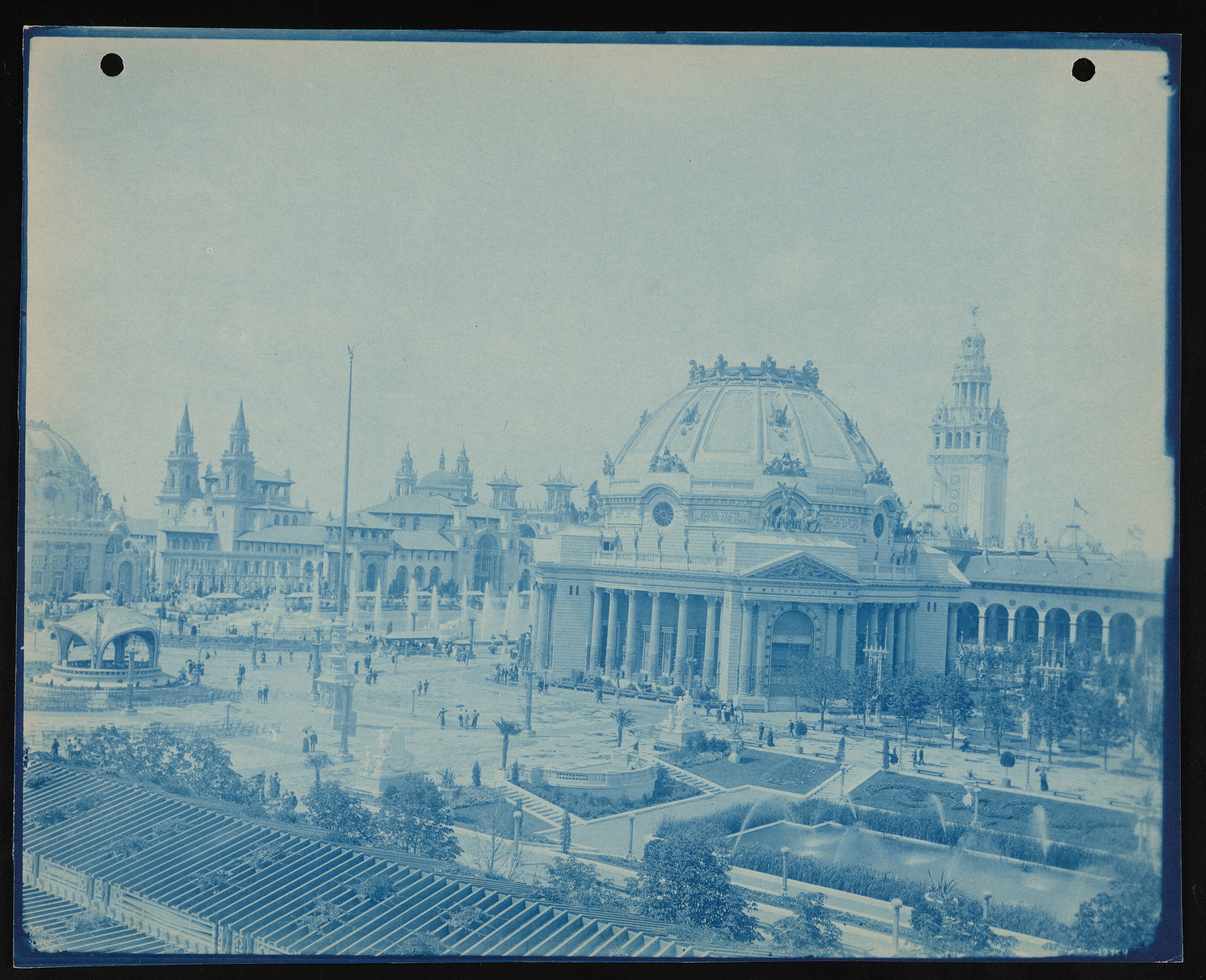 Exterior view of buildings and grounds, with Temple of Music, Machinery and Transportation Building, Electricity Building, Ethnology Building, and Electric Tower as seen from United States Government Building.