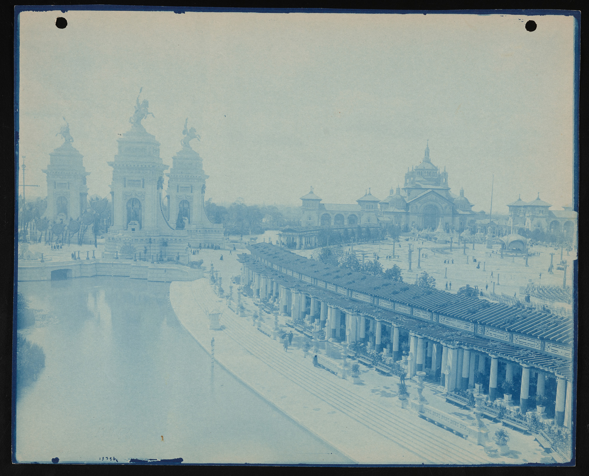 Exterior view of buildings and grounds, with Pergola, entrance pylons, Triumphal Bridge, Mines Building, Horticulture Building, and Graphic Arts Building as seen from the United States Government Building.