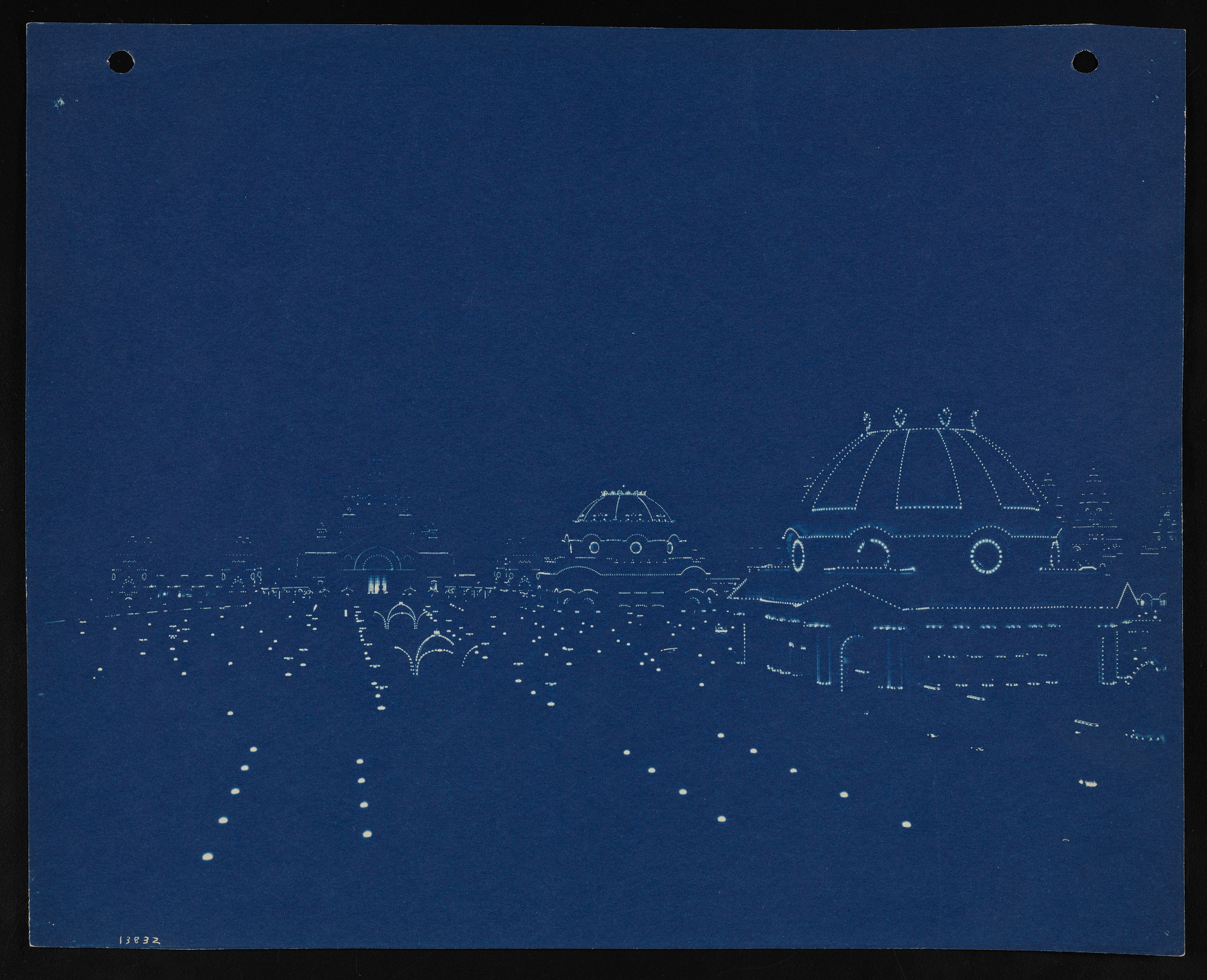 Exterior view of buildings and grounds, with night illumination of Esplanade, Mines Building, Horticulture Building, Graphic Arts Building, Temple of Music, Ethnology Building, and Electricity Building as seen from the United States Government Building.
