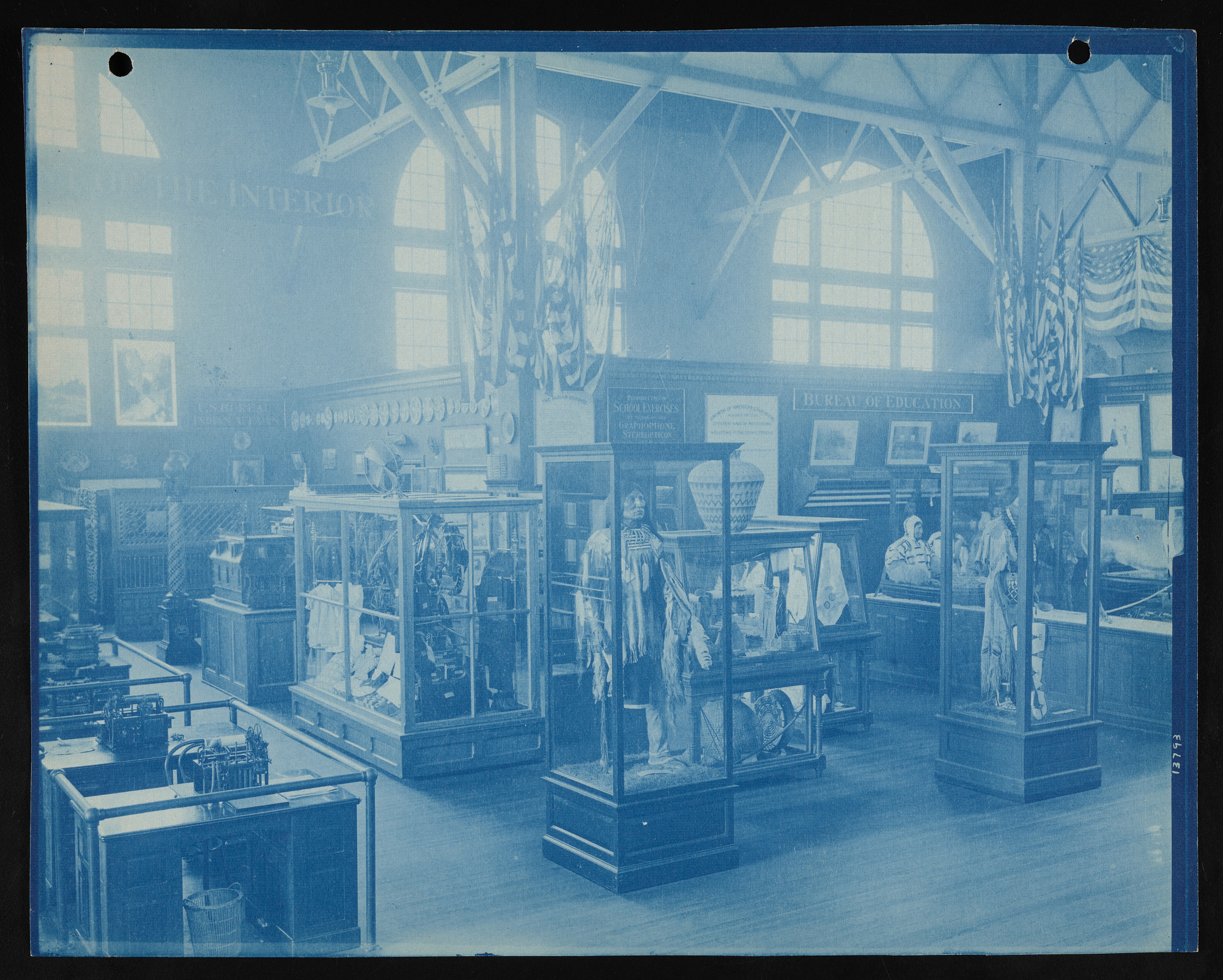 Interior view, Department of the Interior exhibits in the United States Government Building, featuring Bureau of Indian Affairs and Bureau of Education.