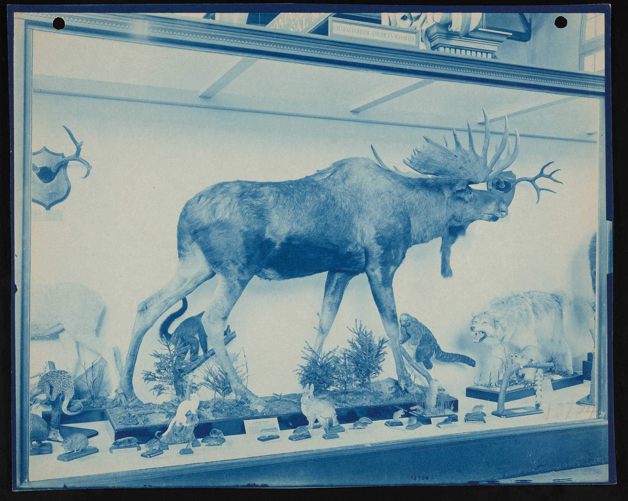 Interior view, Smithsonian Institution and United States National Museum exhibits in the United States Government Building, featuring large mammal case presented by the Department of Biology.