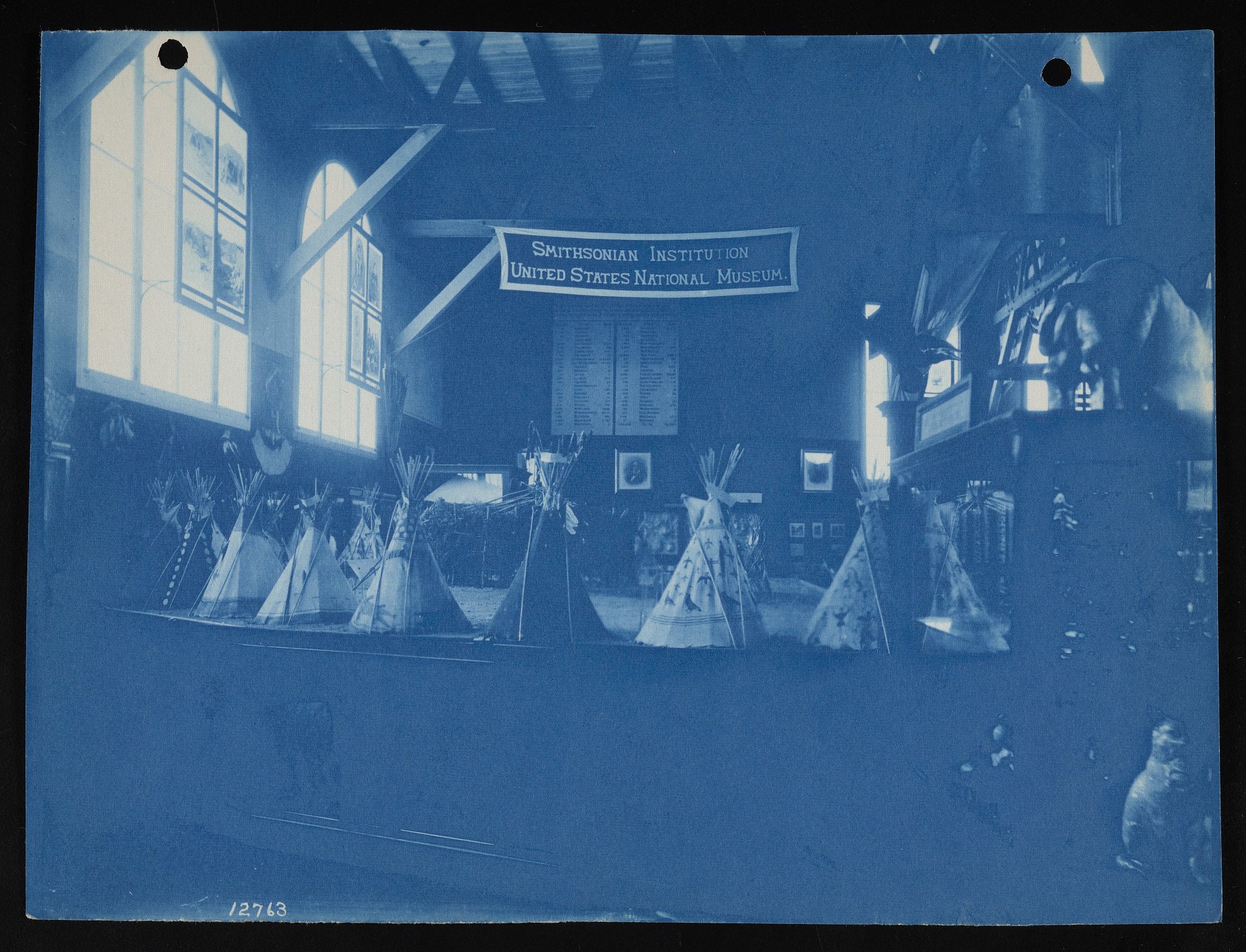 Interior view, Smithsonian Institution United States National Museum exhibits in the United States Government Building, featuring Kiowa camping circle tepees contributed by Bureau of American Ethnology.