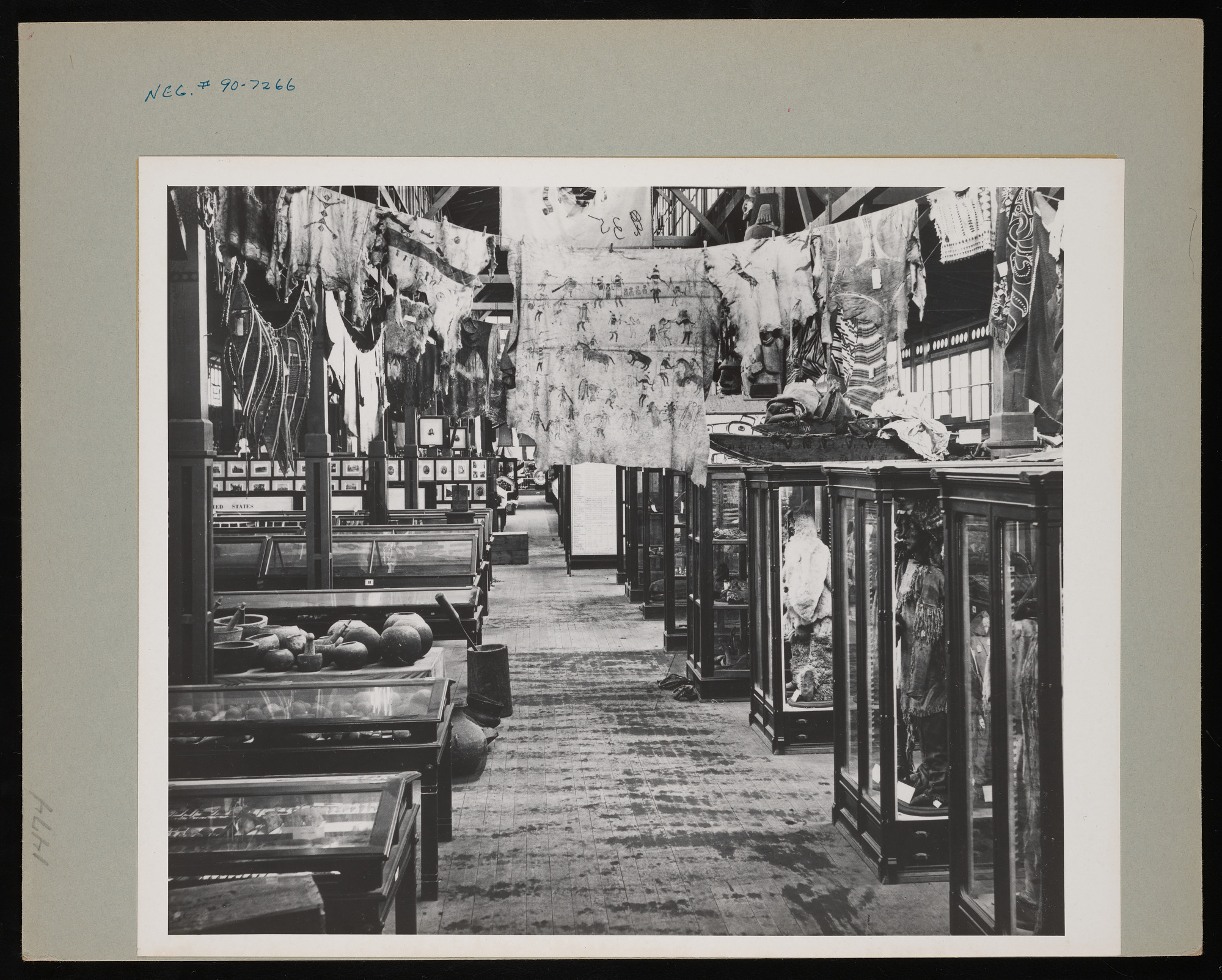Interior view, Department of the Interior exhibits in the United States Government Building, featuring archeological and anthropological artifacts, prepared by Bureau of Indian Affairs and Smithsonian Institution.