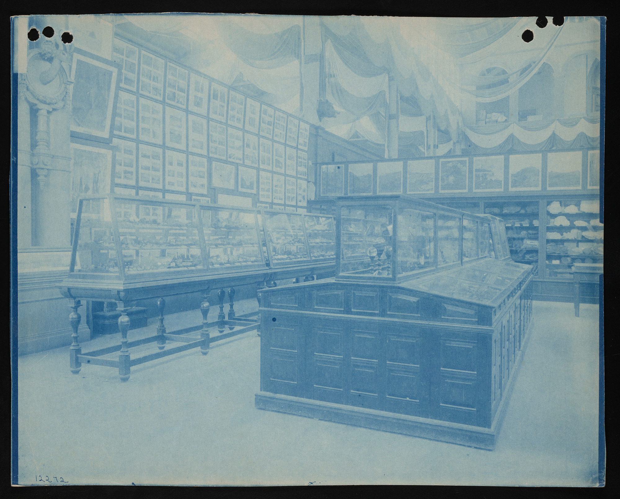 Interior view, Smithsonian Institution and United States National Museum exhibits in the United States Government Building, featuring Department of Mineralogy and Department of Geology.