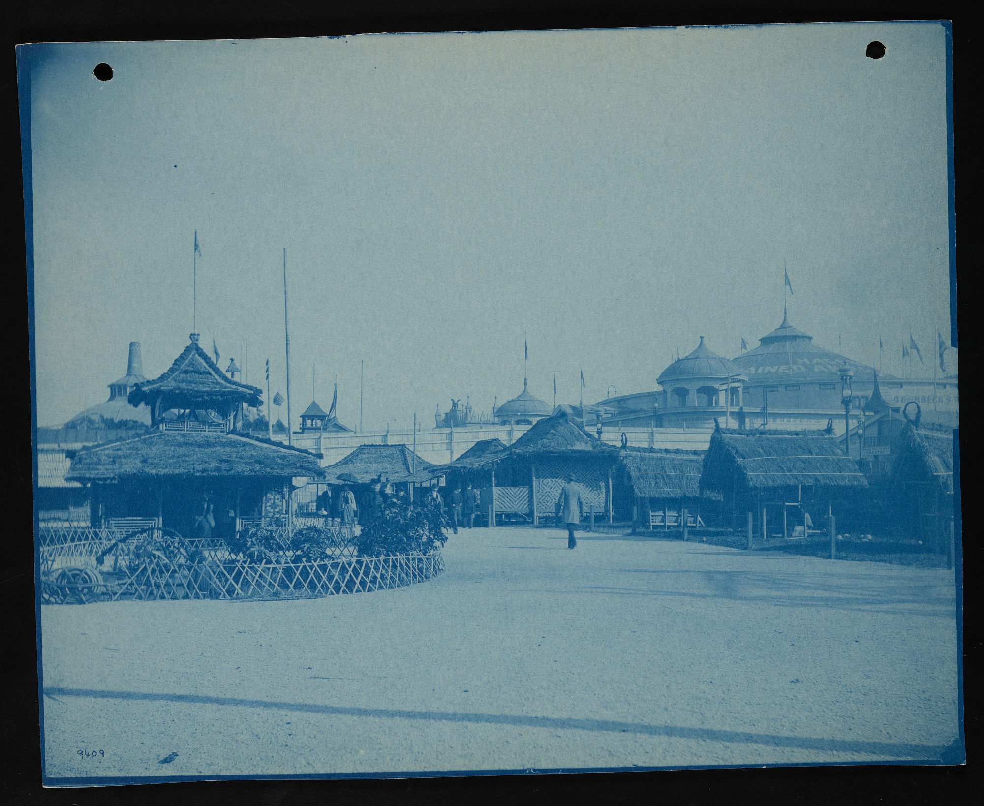 Exterior view of buildings and grounds, Midway Plaisance - Java Village with Hagenbeck's Trained Animals Pavilion in view.