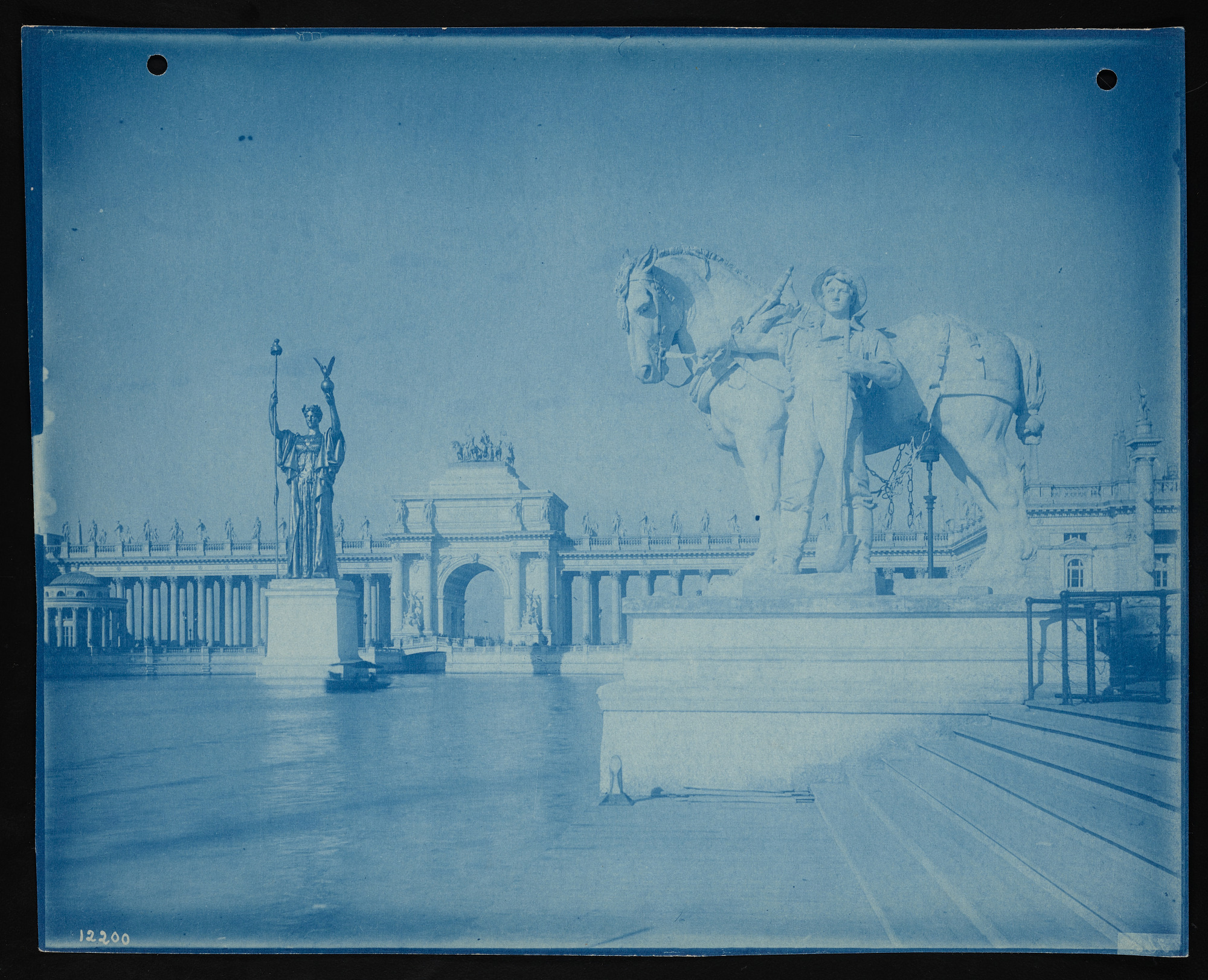 Exterior view of buildings and grounds, with Grand Basin, Peristyle, Statue of the Republic, and "The Farm Horse" sculpture by E.C. Potter in view.