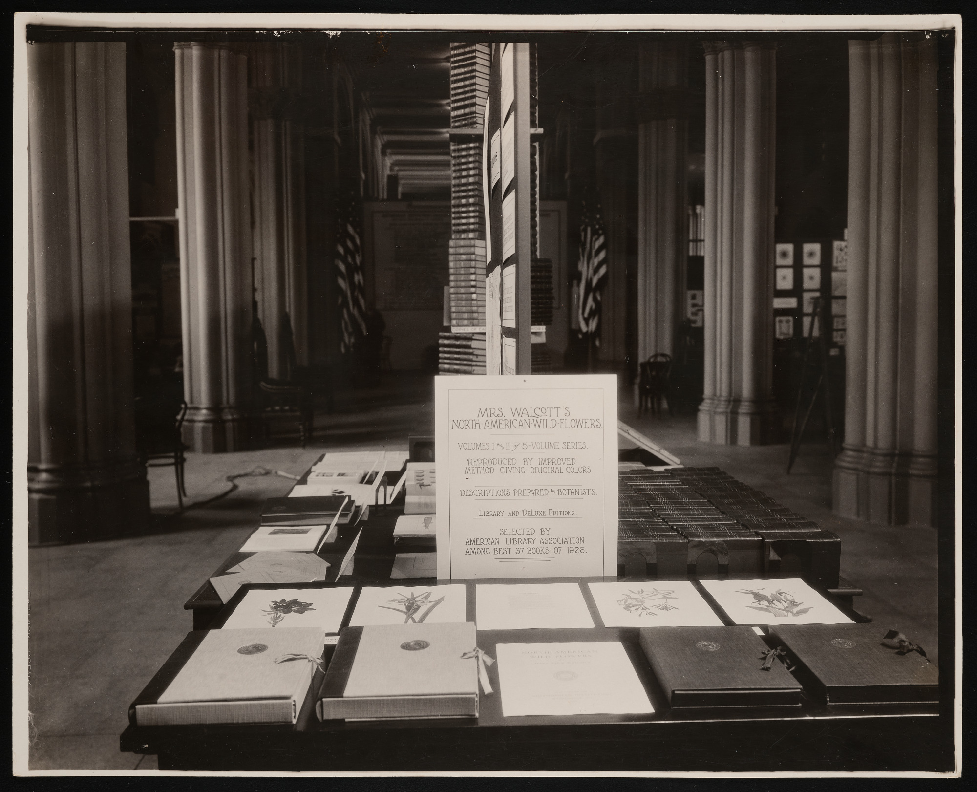 Interior view, library exhibit in the Smithsonian Institution Building, or Castle, featuring books on North American wildflowers by Mary Vaux Walcott.