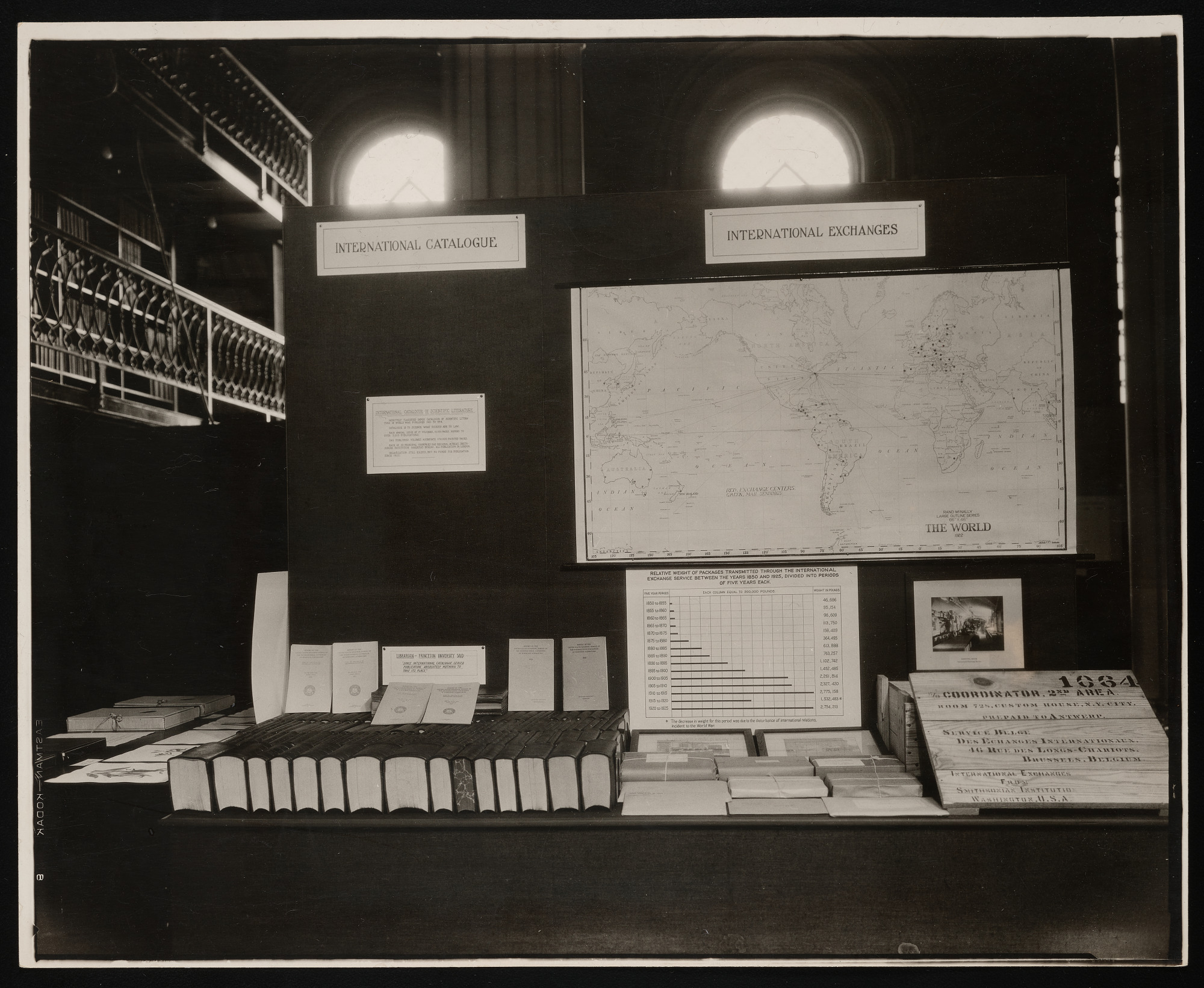 Interior view, International Catalogue and International Exchanges exhibit in the Smithsonian Institution Building, or Castle.