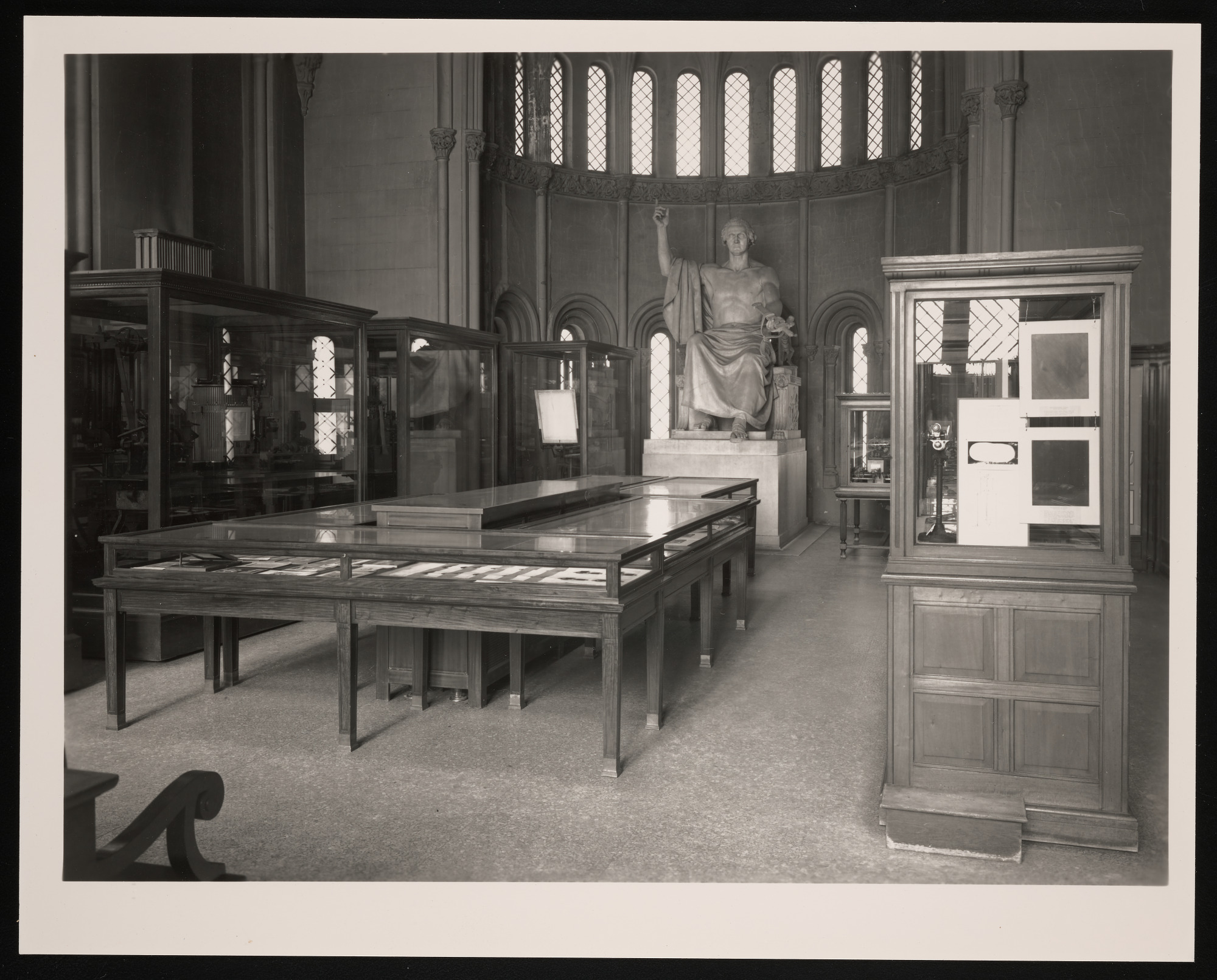 Interior view of the west wing, also known as the chapel, of the Smithsonian Institution Building, or Castle, showing graphic arts exhibits and the marble sculpture of George Washington by Horatio Greenough.