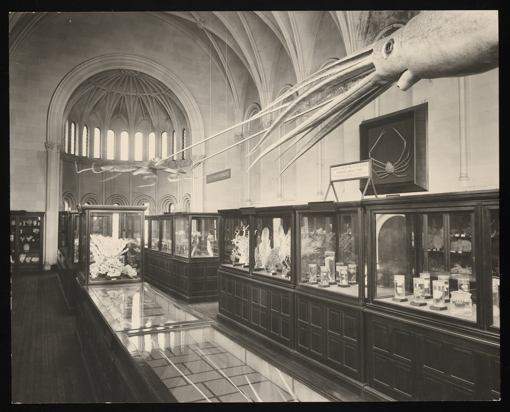 Interior view of the west wing, also known as the chapel, of the Smithsonian Institution Building, or Castle, showing marine invertebrates exhibits.
