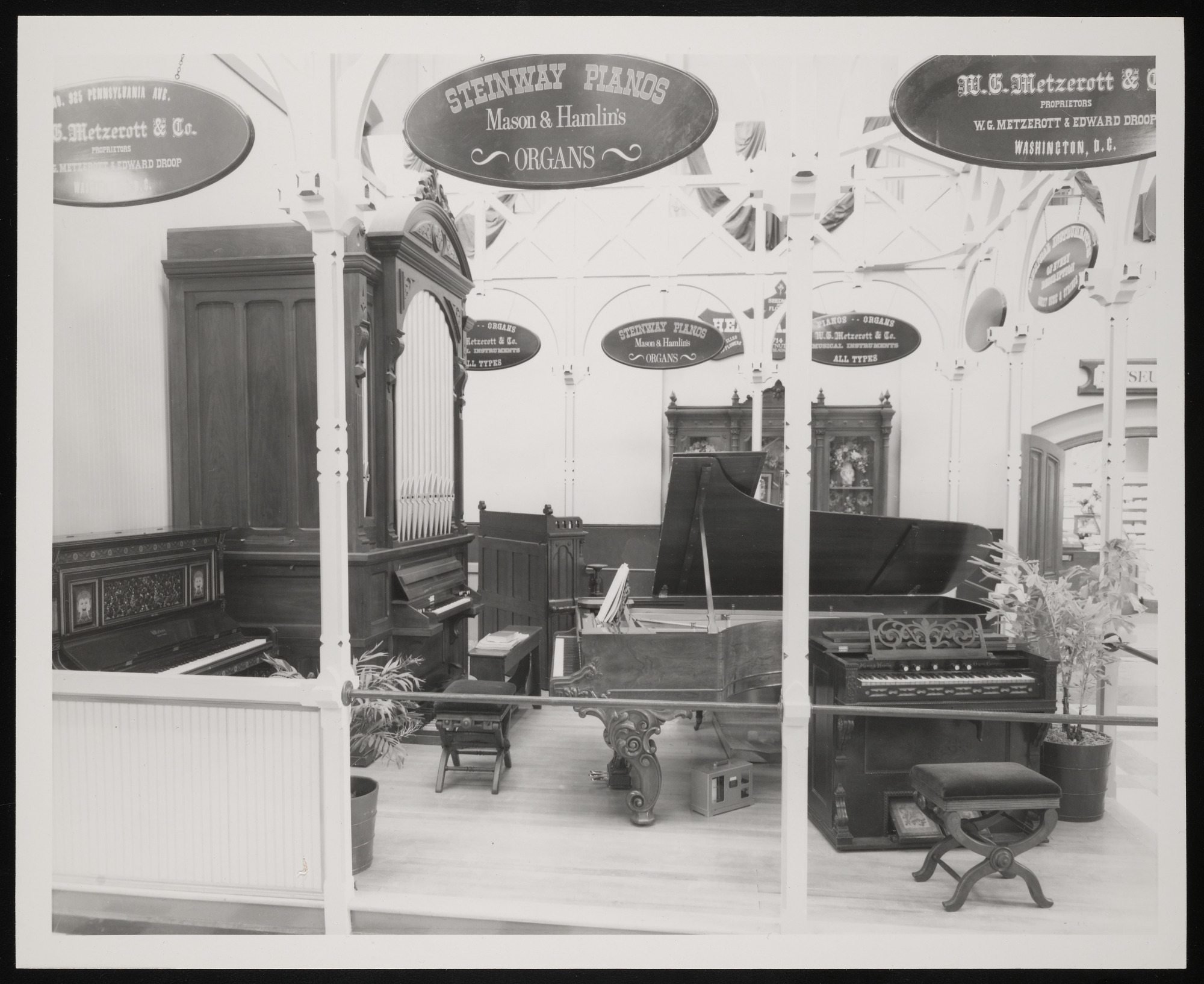 Interior view, musical instruments display at "1876: A Centennial Exhibition" in the Arts and Industries Building, featuring organs and pianos.