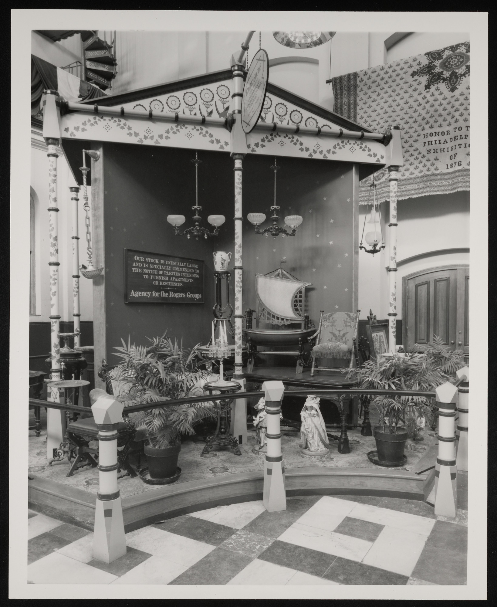 Interior view, parlor furniture exhibit at "1876: A Centennial Exhibition" in the Arts and Industries Building.