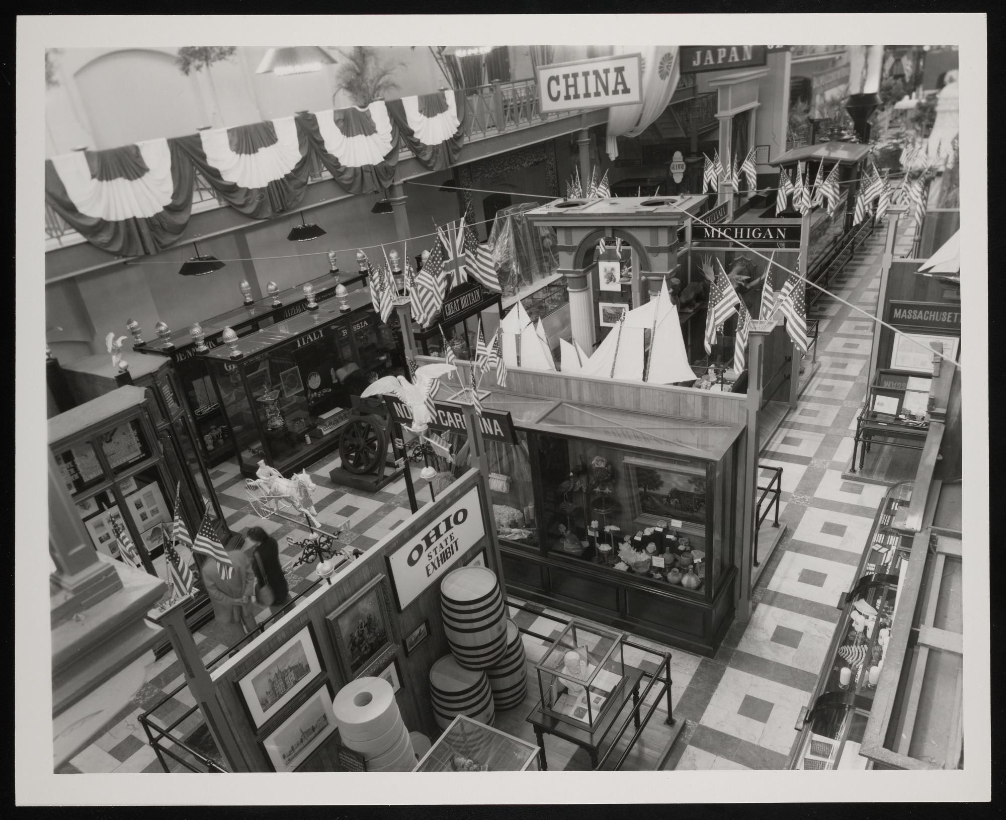 Interior view, states exhibits at "1876: A Centennial Exhibition" in the Arts and Industries Building.