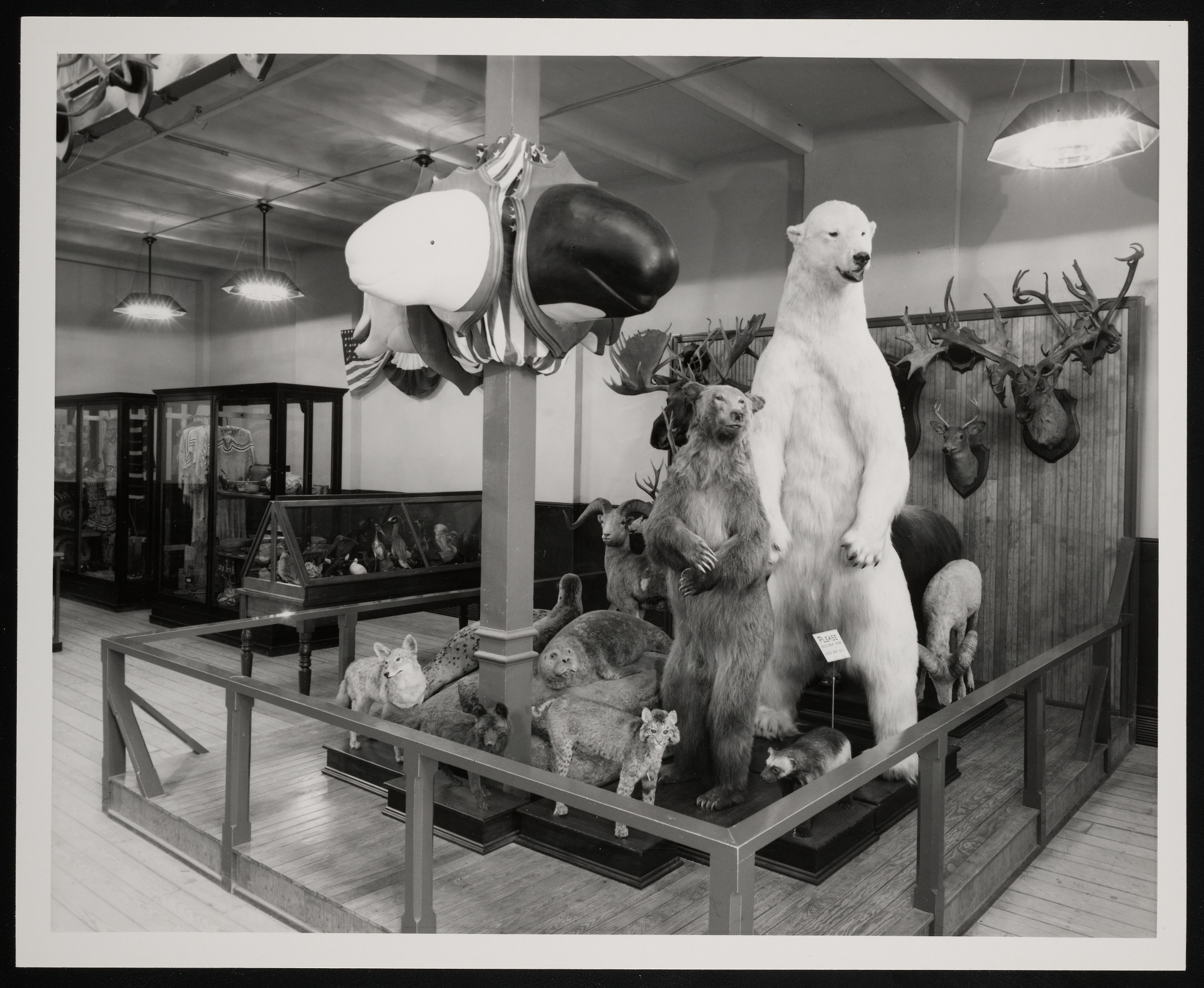 Interior view, mammals exhibit at "1876: A Centennial Exhibition" in the Arts and Industries Building.