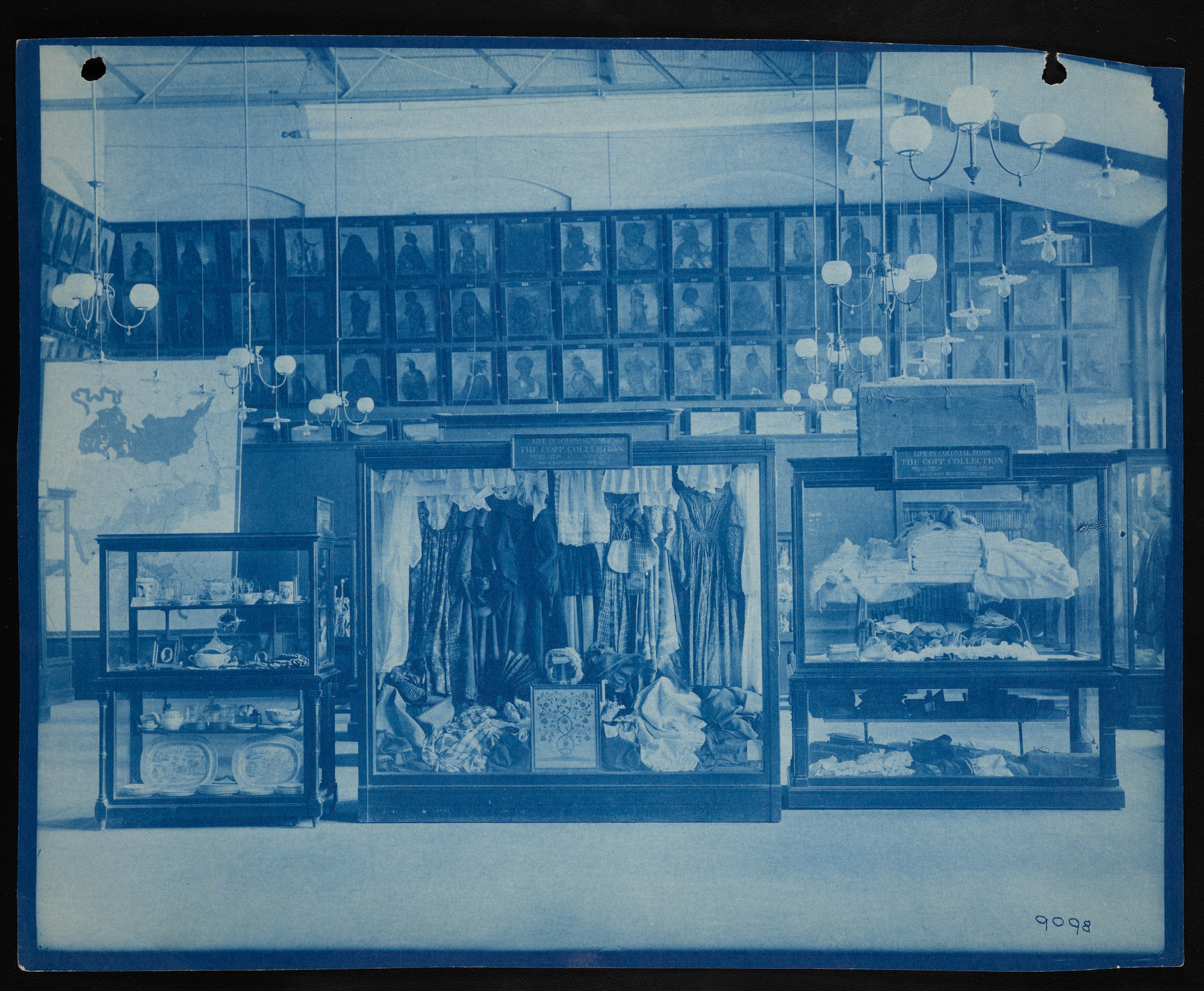 Interior view, Copp collection exhibit cases in the Lecture Room of the United States National Museum, now known as the Arts and Industries Building, featuring artifacts illustrating "Life in Colonial Times," with Catlin Gallery of Indian Paintings in view.