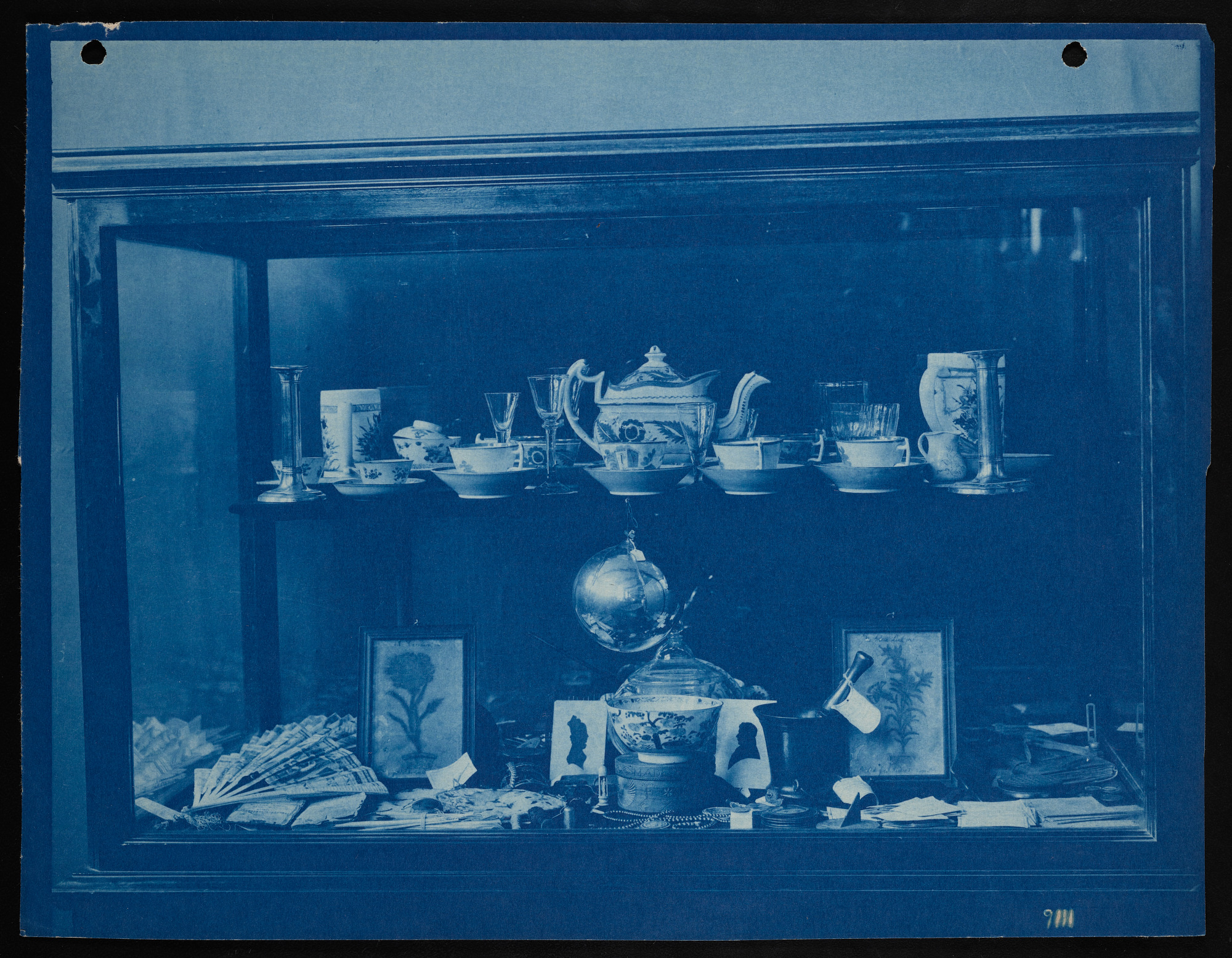 Interior view, Copp collection exhibit cases in the Lecture Room of the United States National Museum, now known as the Arts and Industries Building, featuring artifacts illustrating "Life in Colonial Times," with Catlin Gallery of Indian Paintings in view.