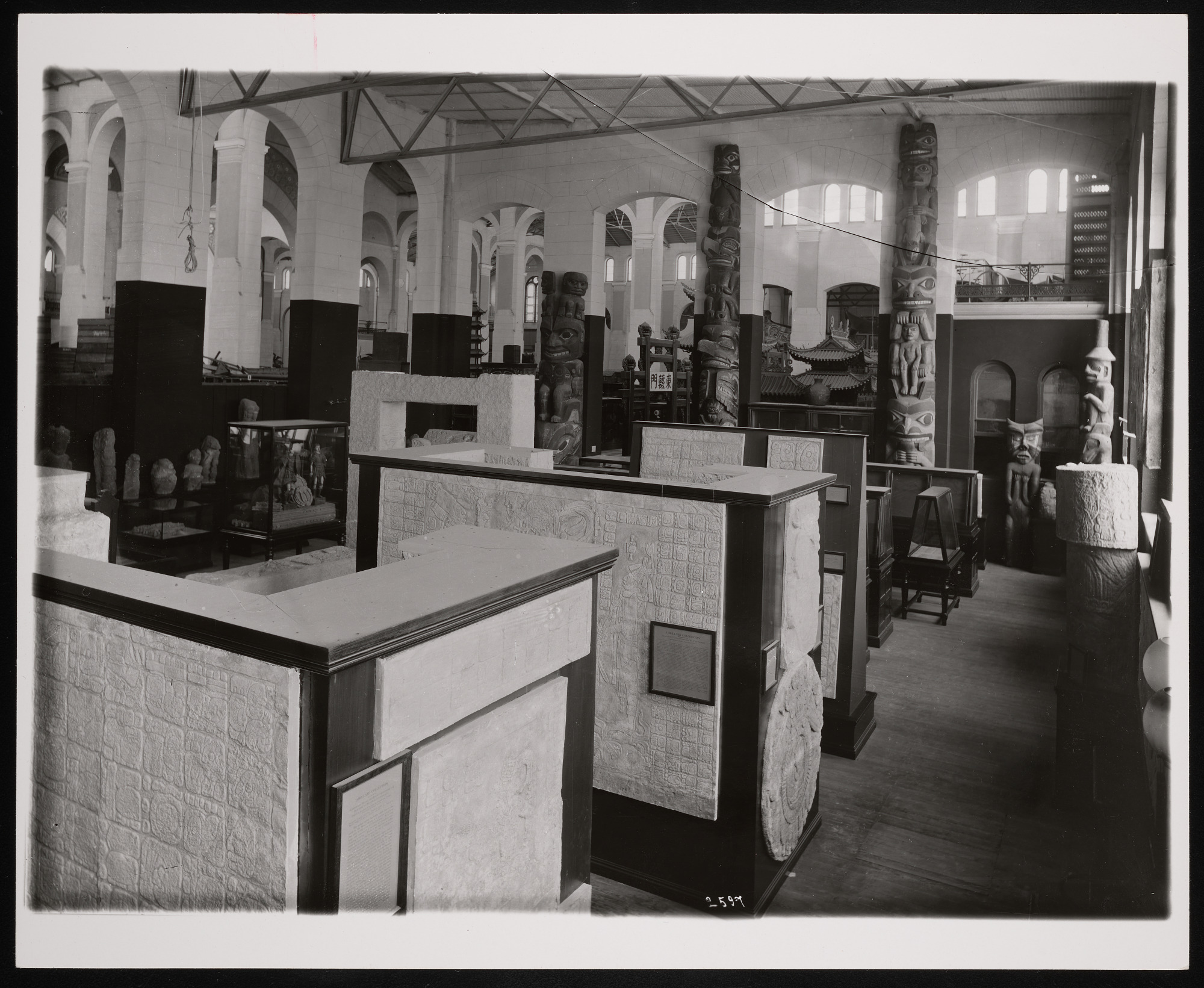 Interior view, antiquities and ethnology exhibits in the United States National Museum, now known as the Arts and Industries Building, featuring casts of wall sculptures and picture writing from the Lorillard collection of antiquities from Central America.