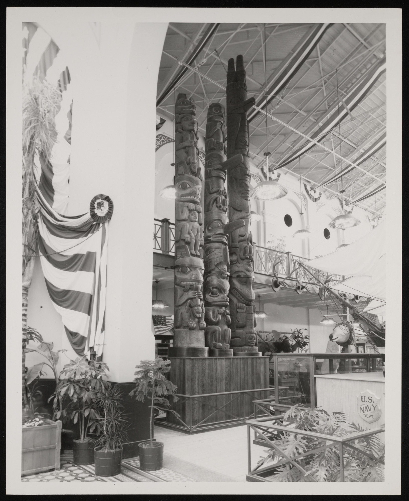 Interior view, ethnology exhibit at "1876: A Centennial Exhibition" in the Arts and Industries Building, featuring totem poles.