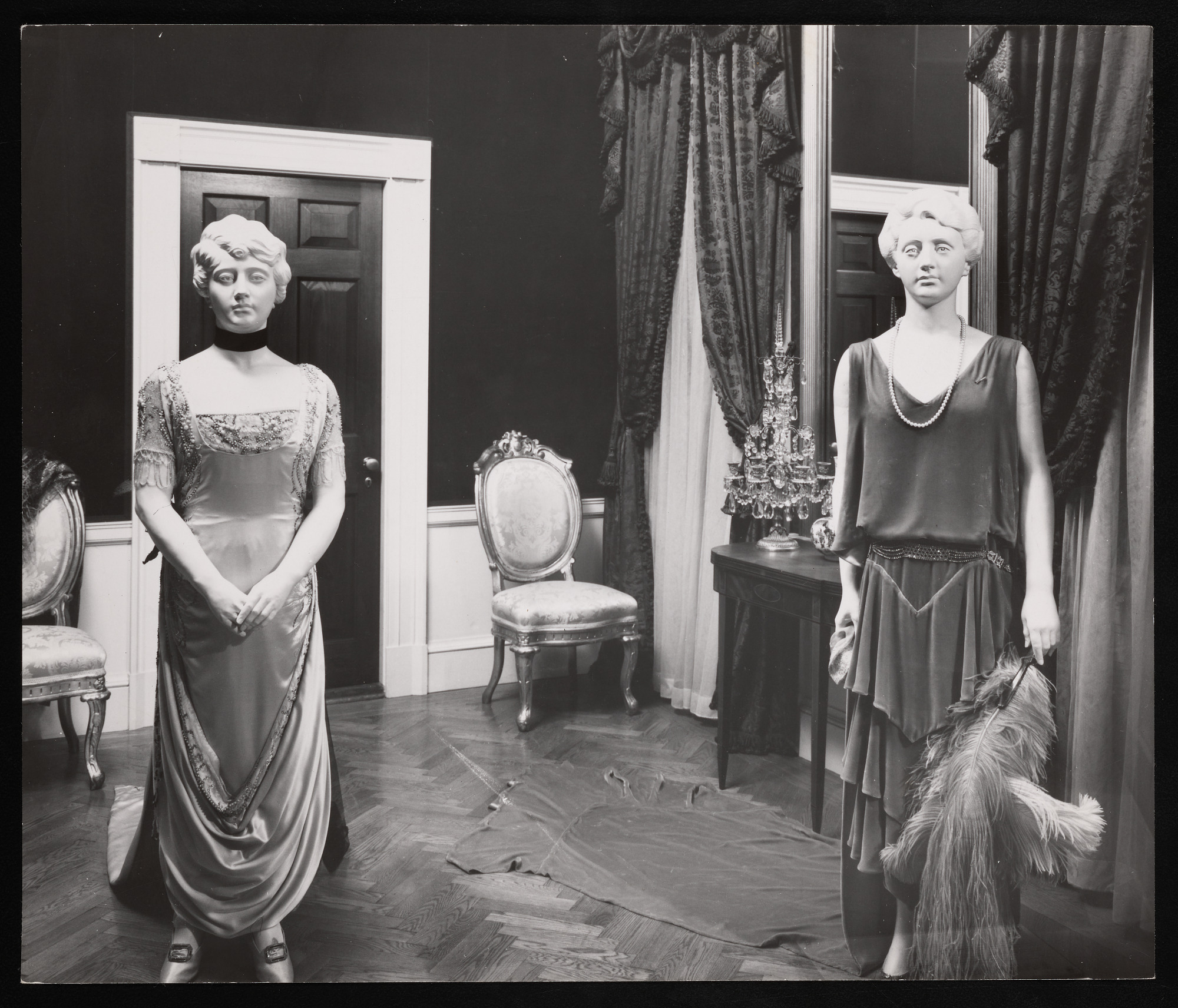 First Ladies Hall in the Arts and Industries Building, featuring dresses worn by Florence Kling Harding and Grace Goodhue Coolidge, with gowned figures placed in a likeness of the Red Room of the White House.