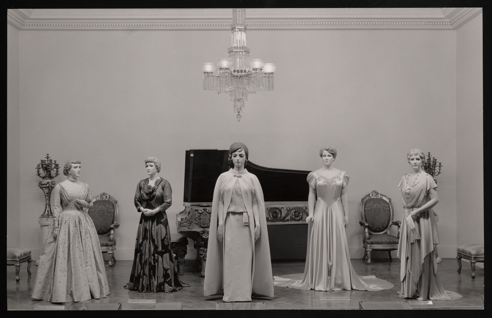 First Ladies Hall in the Arts and Industries Building, featuring dresses worn by Mamie Doud Eisenhower, Bess Wallace Truman, Jacqueline Kennedy, Eleanor Roosevelt, and Lou Henry Hoover, with gowned figures placed in a likeness of the East Room of the White House.