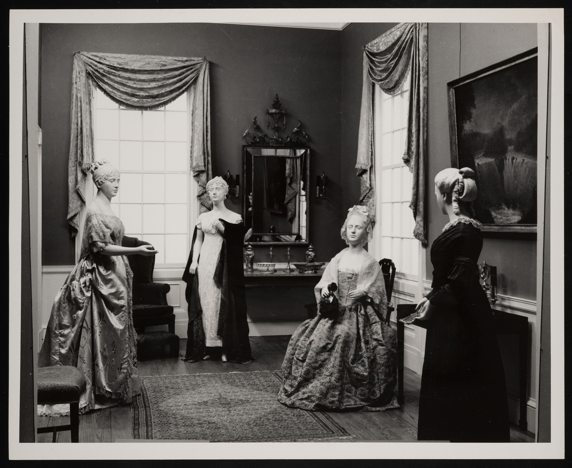 First Ladies Hall in the Arts and Industries Building, featuring dresses worn by Dolley Madison, Martha Jefferson Randolph, Martha Washington, and Abigail Adams, with gowned figures placed in a likeness of a room in the White House (1789-1817).